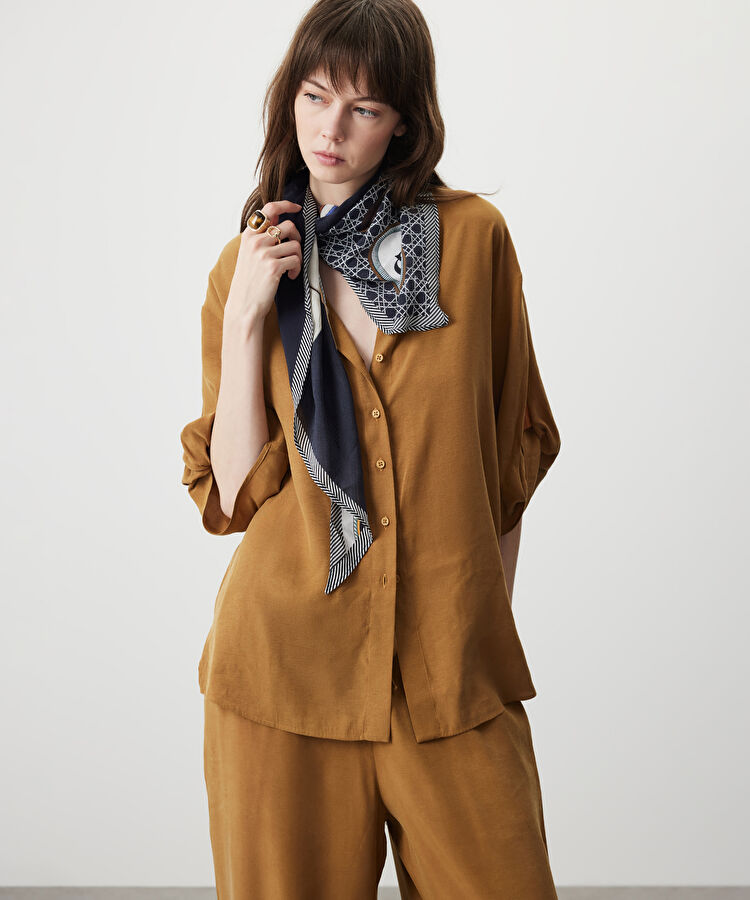 Brown-tonlu **Kumaş mix colorblock gömlek**, burgundy **Belden bağlamalı wide leg fit pantolon** ve brown **Suni deri babuç** ile dengeli, rahat ama etkili bir kombin.
