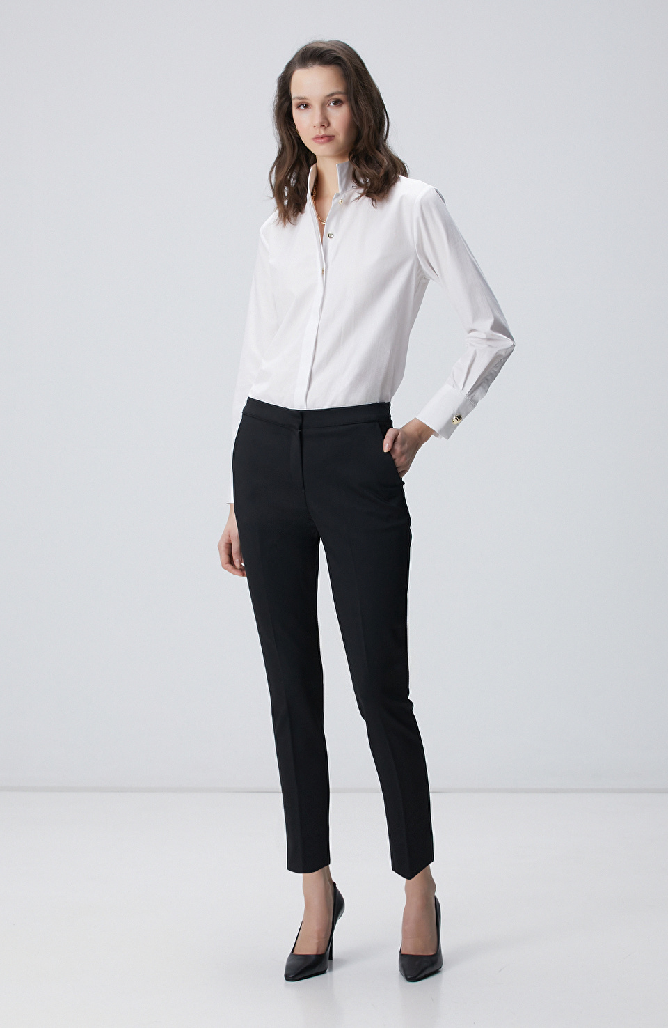Düşük omuz gömlek, kemerli şalvar, sivri topuklu bot ve uzun trençkot — rahat ama keskin bir şehir tarzı.