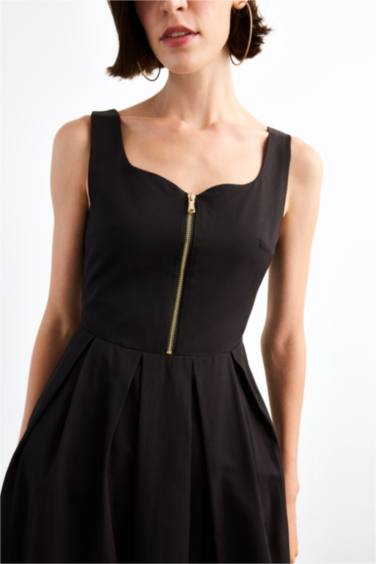 Kalp Yaka Fermuarlı Askılı Midi Elbise