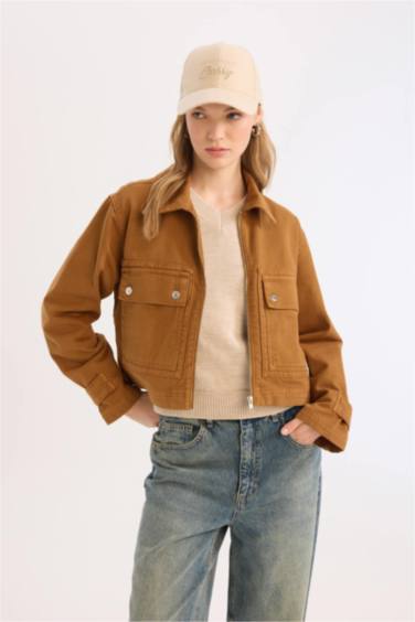 Crop Dik Yaka Fermuarlı Cepli Gabardin Ceket