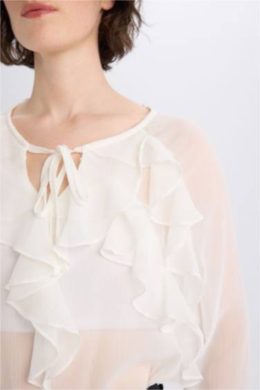 Regular Fit Yuvarlak Yaka Fırfırlı Şifon Uzun Kollu Bluz