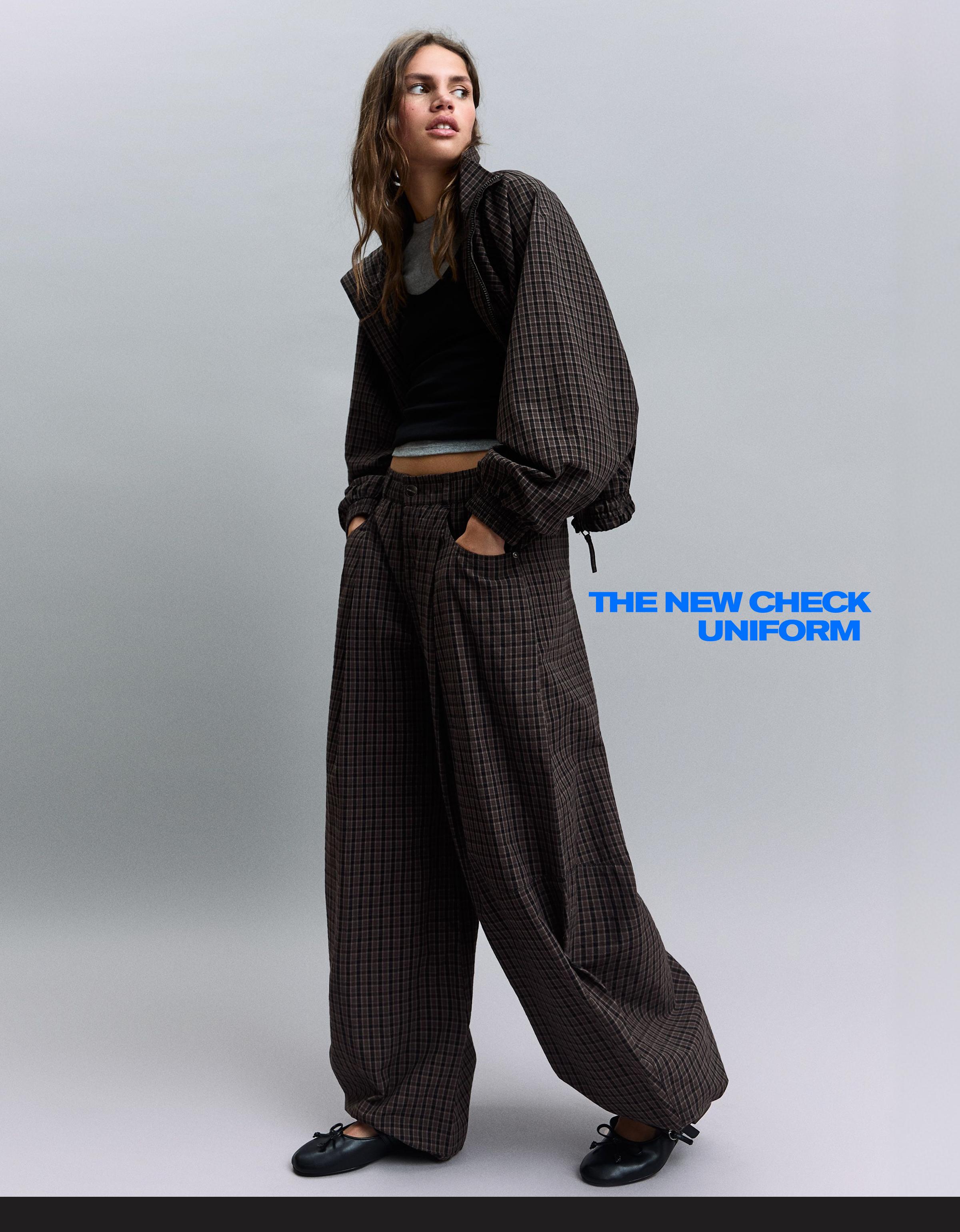 Kareli paraşüt pantolon, minimalist anlayışla sade ama dikkat çeken bir parçadır. Klasik kare deseniyle hem şıklık hem de rahatlık sunar. Uzun gövdeli tipler için idealdir çünkü vücut hatlarını yumuşatır ve uzunluğu dengeleyici bir etki yaratır. Beyaz tisörtle ve yüksek bel jeans ile kombinleme yaparak gündelik bir streetwear tarzı oluşturabilirsin; aynı zamanda siyah bluz ve beyaz sneaker ile ofis-sonrası bir buluşturma için de uygun. Renk paletindeki kahve, siyah ve bej tonları, notr temalara kolayca uyum sağlar. Siyah deri kemer ve düz topuklu ayakkabı ile daha ciddi bir hava kazandırabilirsin. Giyim sırasında katlanmadan astırmak, dokusunu korumak açısından önemlidir. İç katman olarak da kullanılabilir; kalın bir mont veya ceket altında şıkça görülebilir.