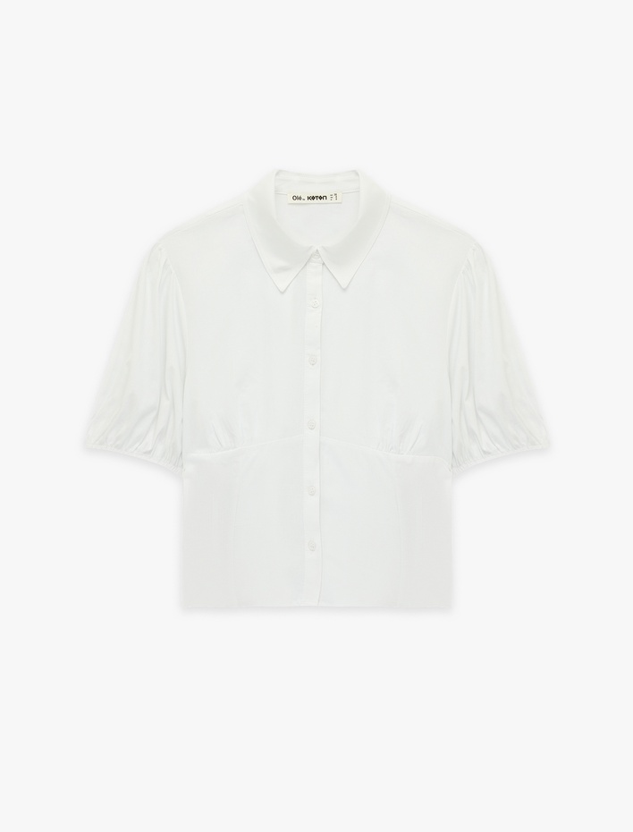 Pamuklu Slim Fit Kısa Balon Kollu Klasik Yaka Crop Bluz