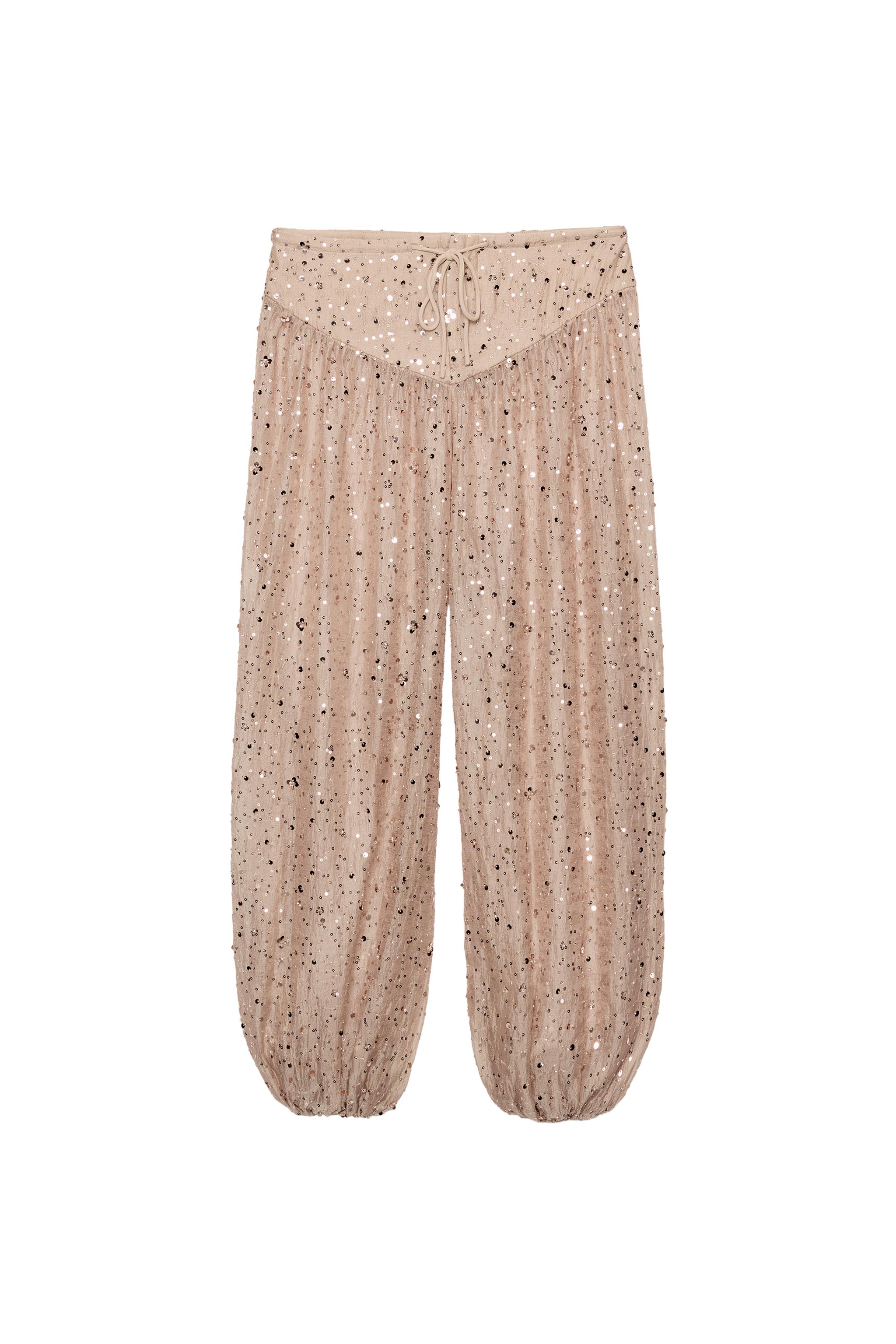 Bu pullu şalvar pantolon, rahat ama dikkat çeken bir dengede modaya sahip. Beige ve gold renkleriyle hem doğal hem de şık bir hava yaratıyor. Uzun gövdeli tipler için ideal çünkü vücut hatlarını sadece destekleyip öne çıkarmıyor, aynı zamanda uzunluğu dengeliyor. Geniş omuzlara sahip olanlar için ise bu model, bel kısmıyla dengelenmiş bir görünüm sunuyor. Yazın açık havada pikniklerde veya sonbahar aksam yürüyüşlerinde oldukça uygun. Gece partilerine veya tatil günlerinde de çok iyi duruyor. Beyaz tisörtle ve yüksek bel jeans ile kombinleme yaparsanız, günlük bir şıklık elde edersiniz. Aynı zamanda siyah deri kemer ve beyaz sneaker ile tamamlayarak daha dinamik bir look da oluşturabilirsiniz. Kullanım sırasında dikkatli katlanmadan asılması ve iç katman olarak da kullanılması öneriliyor. Her mevsimde rahatça giyilebilen bu pantolon, pratiklikle şıklığı bir araya getiriyor.