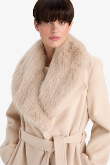 -%60Regular Fit Suni Kürk Yaka Kuşaklı Kaşe Uzun Kaban