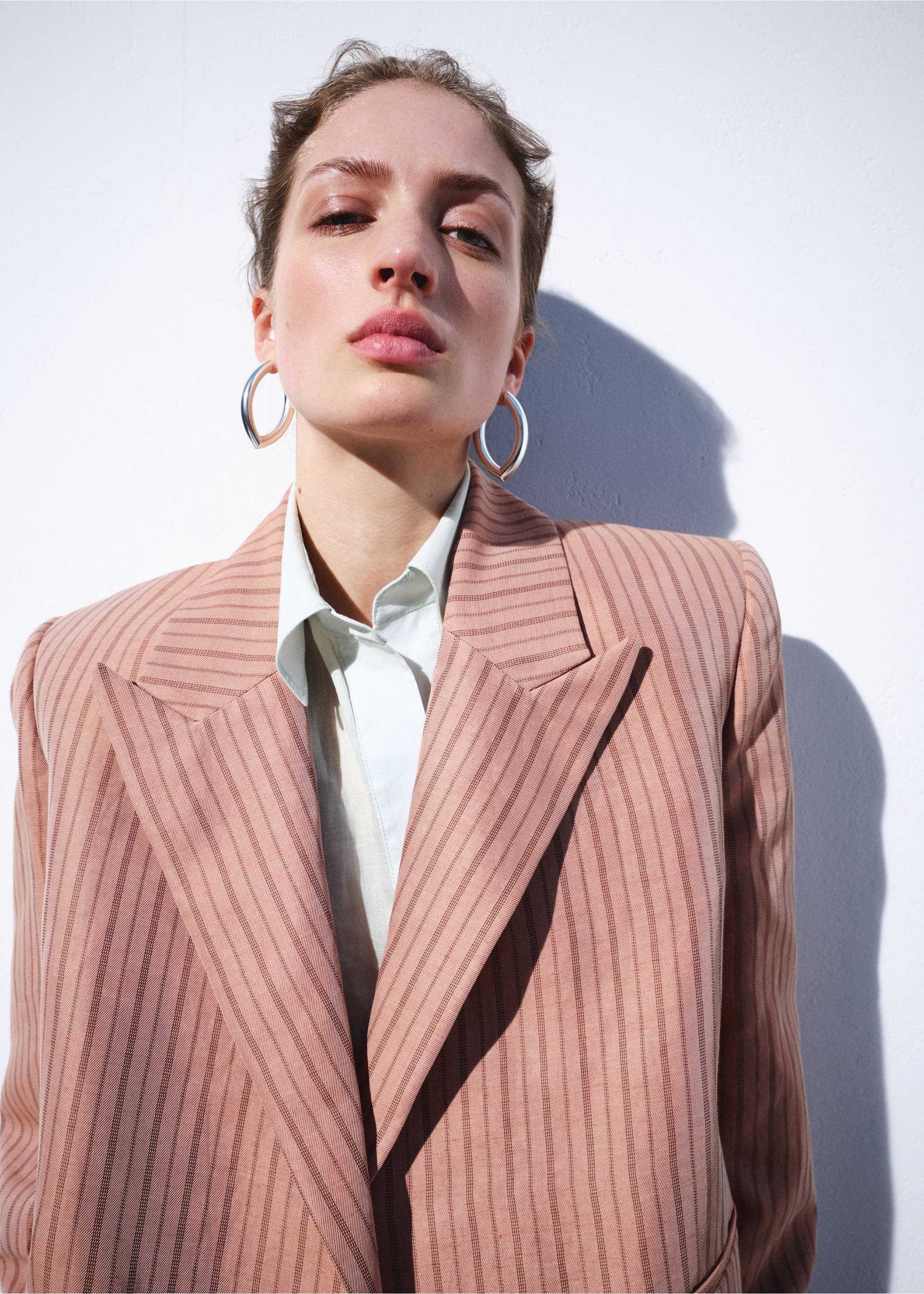 Peach tonu ile hafif bir sıcaklık katan bu çizgili keten crop blazer, temiz ve sade bir estetikle dikkat çeker. Uzun gövdeli tipler için idealdir; omuzlarından aşağıya doğru yayılan çizgiler vücut hatlarını daha dengeli gösterir. Yaz aksamı yürüyüşlerinde veya ofis sonrası buluşmalarda şık bir katman olabilir. Beyaz tisörtle ve yüksek bel jeans ile kombinleme yaparsanız, günlük yaşamda da rahatça giyilebilir bir görünüm elde edersiniz. Aynı zamanda bej renkli pantolonla veya krem tonlu etekle de çok iyi durur. Siyah deri kemer ve beyaz sneaker ile tamamlayarak modern bir akademik tarz oluşturabilirsiniz. Ürünün doğal dokusu nedeniyle katlanmadan asılı tutulması, hem dokusunu korur hem de her kullanımda yeniden canlanır. İç katman olarak da kullanılabilir, özellikle hafif bir rüzgarlı günlerde dışarıda çok pratik olur.