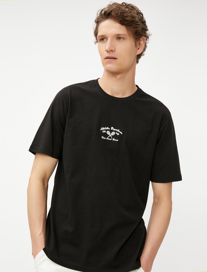 Kolej İşlemeli Tişört Bisiklet Yaka Kısa Kollu Pamuklu