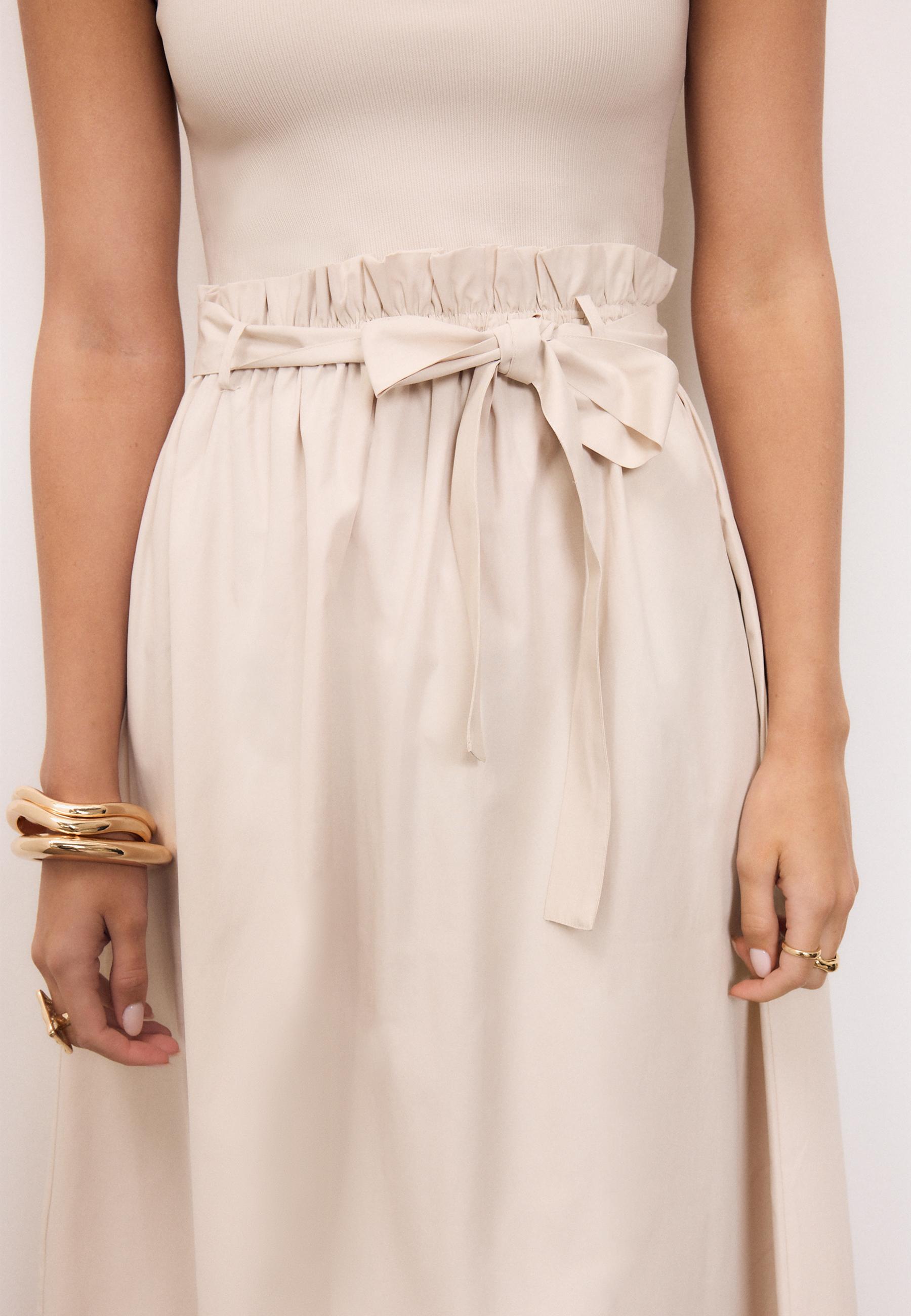 Beige ve krem tonlarında basit ama dikkat çekici bir detayla dikkat çeken bu iki malzemeli midi elbise, temiz hatlar ve zevkli kesimle minimalist anlayışın en güzel örneğidir. Uzun gövdeli tipler için idealdir; omuz hizasında kavuşturan yaka ve vücutta sarkmadan oturan kesimi vücut tipine göre dengeli bir görünüm sunar. Güneşli bir yaz gününde beyaz tisörtle ve yüksek bel jeans ile kombinleme yaparak rahatça sokaklarda dolaşabilirsin. Aynı elbiseyi ofis-sonrası bir buluşturma için siyah deri kemer ve beyaz sneaker ile tamamlayarak daha şık bir hale getirebilirsin. Krem tonu, doğal ışık altında çok zarif bir etki yaratır; iç katman olarak da giyilebilir, kolları kısa olduğu için sıcak havalarda da rahatlıkla kullanılabilir. Kuruturken asılı tutmaya özen göster, bu sayede kalitesini uzun süre koruyabilirsin.
