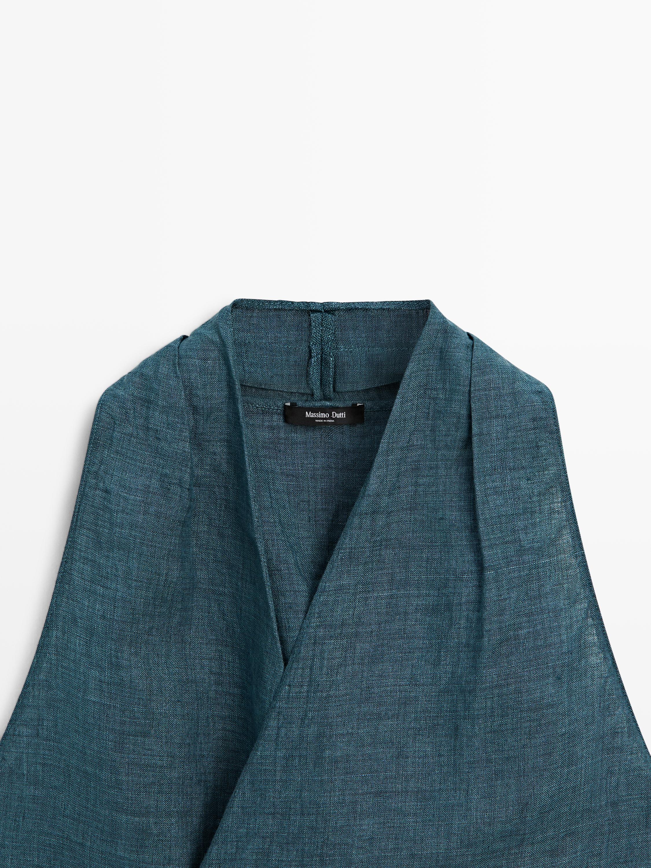Bu bağcıklı keten kruvaze bluz, temiz ve sade bir estetikle dikkat çeken, aynı zamanda rahat bir taşımaya sahip olan bir parçadır. Ketenin doğal dokusu ve hafif pürüzlü dokusu, giyildiğinde hafif bir dokunsal deneyim sunarken, bağcık detayı da minimalist anlayışa uygun bir vurgu sağlar. Teal ve koyu yeşil renkleriyle hem doğal hem de şık bir görünüm sunar. Uzun gövdeli tipler için idealdir; omuzlarınıza hafifçe değen boyutu, uzun boylara uygun bir dengede bulunur. Geniş omuzlara sahip olanlar için ise omuz hatlarını daha dengeli gösterir. Yazın açık havada yürüyüşlerde veya sonbahar aksamında ofis-sonrasi bulusmalarda eşsiz bir konfor sunar. Beyaz tisörtle ve yüksek bel jeans ile kombinleme yapabilirsiniz; bu kombin, gün içinde rahatça taşınabilecek bir tarz oluşturur. Aynı zamanda siyah deri kemer ve beyaz sneaker ile tamamlayarak daha şıklı bir hale getirebilirsiniz. İç katman olarak da kullanılabilir; klasik bir kot pantolonla birlikte, hafif bir overol tarzı yaratabilirsiniz. Daha çok kuru temizlik önerilir; katlanmadan asılı tutulması, dokusunu korur. Her gün kullanmak için oldukça dayanıklıdır.