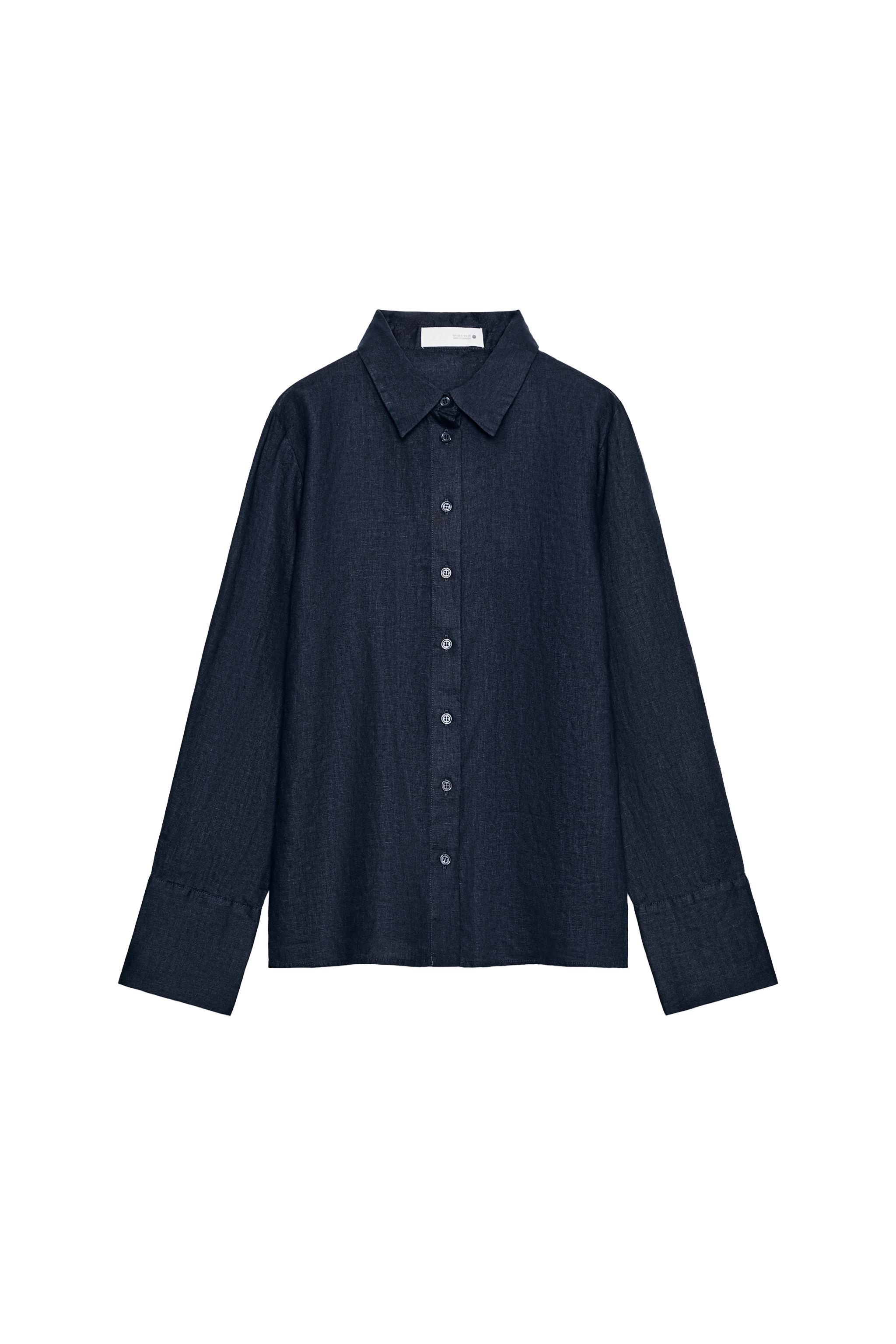 Bu zara gömleği, temiz hatlar ve dengeli detaylarla minimalist tarzın en sadık temsilcisi. Denim gibi doğal dokulu keten kumaşı, hafif bir sarkma ve rahat bir kesimle giyimi hafifletirken, aynı zamanda hafif bir kontrast yaratır. Navy ve dark blue renkleriyle hem ofis hem de günlük kullanım için uygun bir seçenek sunar. Uzun gövdeli tipler için idealdir; omuz çizgilerini yumuşatıp vücut hatlarını dengeler. Bahar ve sonbahar aylarında, hafif bir kaban veya blazerle kombinlenebilir. Beyaz tisortle ve yüksek bel jeans ile casual bir görünüm elde edebilirsin; aynı zamanda siyah deri kemer ve beyaz sneaker ile daha şık bir look da oluşturabilirsin. Giyimi sırasında kırışıklıkları önlemek için katlanmadan asmayı tercih edebilirsin. İç katman olarak da kullanılabilir, bu da giyim seçeneğini genişletir.