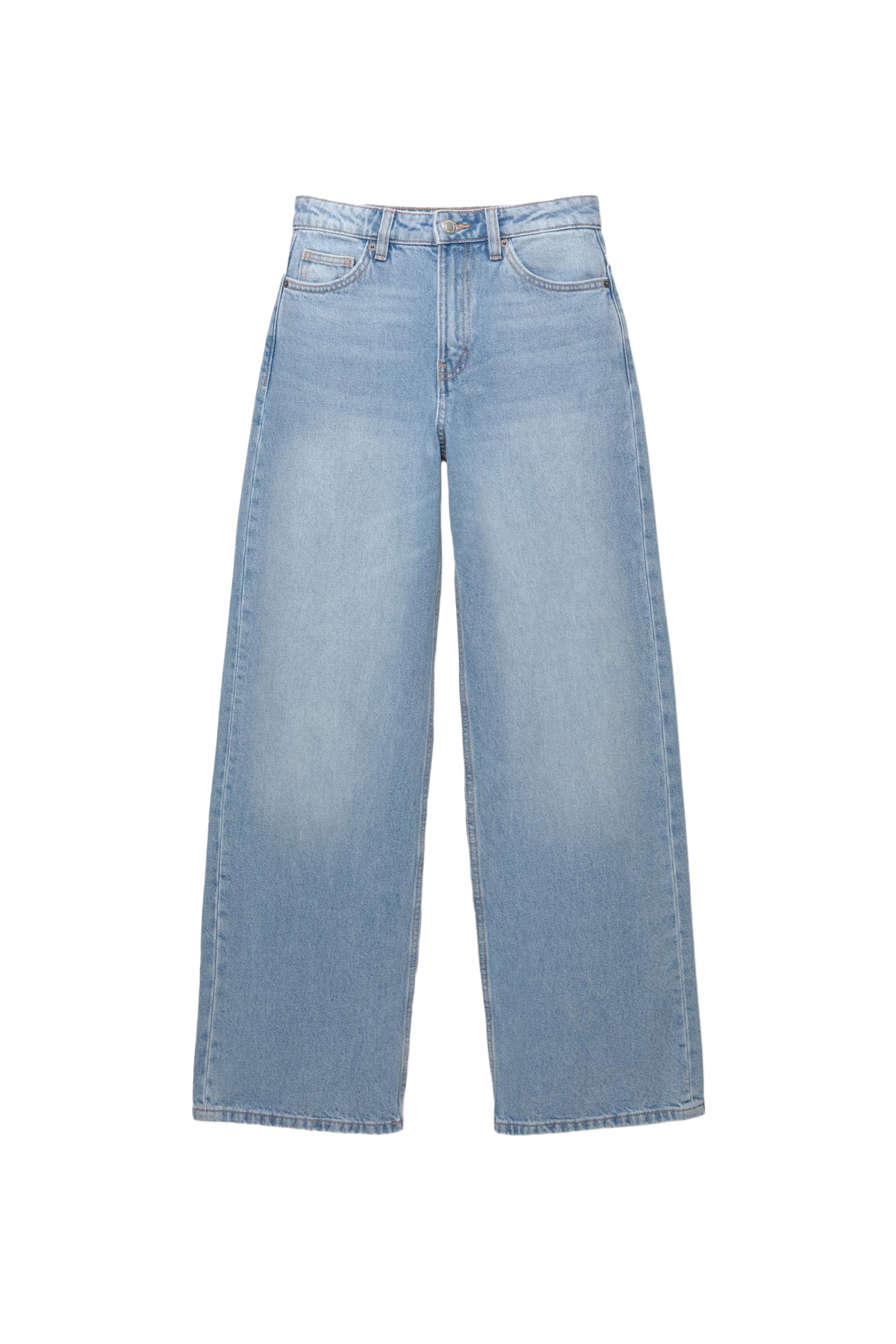 Pamuklu kumaştan üretilen, beş cepli, kemer tokalı, düğmeli ve fermuarlı, wide leg yüksek bel jean.