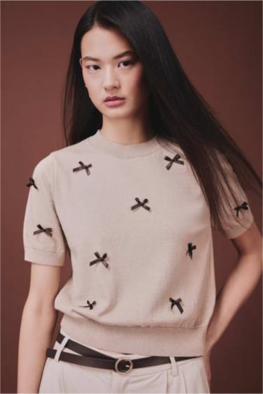 Beige ve siyah renklerde sunulan bu fiyonklu kısa kollu kazak, temiz hatlar ve minimal detaylarıyla her zaman işin içine girebilecek bir parca. Uzun gövdeli tipler için idealdir; omuz hizasındaki fiyonklar vücut hatlarını dengeler ve daha dikkat çekici bir görünüm sağlar. Yazın açık giysilerin altına veya kışın hafif bir katman olarak kullanılabileceği gibi, sonbahar aksam yürüyüşlerinde de oldukça uygun. Beyaz tisörtle ve yüksek bel jeans ile kombinleme, rahat ama şık bir günlük tarz oluşturur. Aynı zamanda siyah pantolonla da ofis-sonrasi bulusmalarda etkili olabilir. Siyah deri kemer ve beyaz sneaker ile tamamlayarak modern bir dokunuş ekleyebilirsin. Kurutma sırasında asılı bırakmak, kumaşın şekli bozulmaması için en iyi yöntemdir. Kolları kısalığından dolayı iç katman olarak da kullanılabilir.
