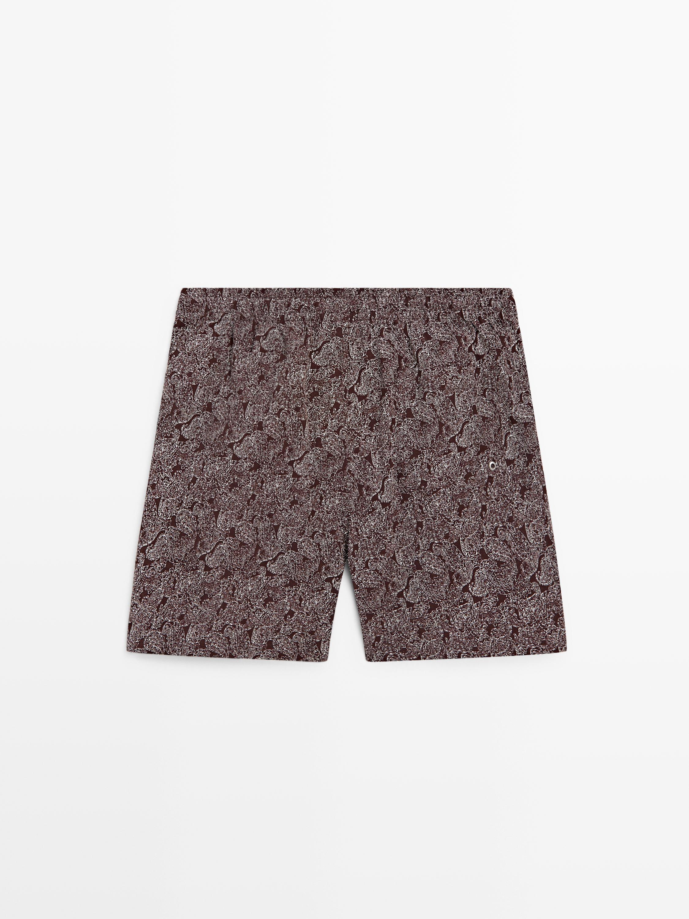 Burgundy ve beyaz paisley deseniyle dikkat çeken bu deniz şortu, hem klasik hem de bohemian bir havaya sahip. Uzun govdeli tipler için ideal çünkü bel kısmı rahat ama vücut hatlarını hafifçe vurgular. Güneşli bir yaz gününde veya baharın sonunda plaj yürüyüşlerinde oldukça uygun. Beyaz tisörtle ve yüksek bel jeans ile casual bir gündüz kombini yapabilirsin; aynı zamanda açık renk bir bluzla da daha serin bir görünüm elde edebilirsin. Aksesuar olarak siyah deri kemer ve beyaz sneaker ile tamamlayabilirsin. Kuru temizlik önerilir, katlanmadan asılı tutmak en iyi bakımdır. Hem günlük giyimde hem de tatilde rahatça kullanılabilecek bir parçadır.