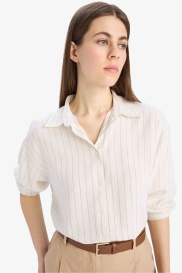 Loose Fit Çizgili Keten Karışımlı Uzun Kollu Gömlek