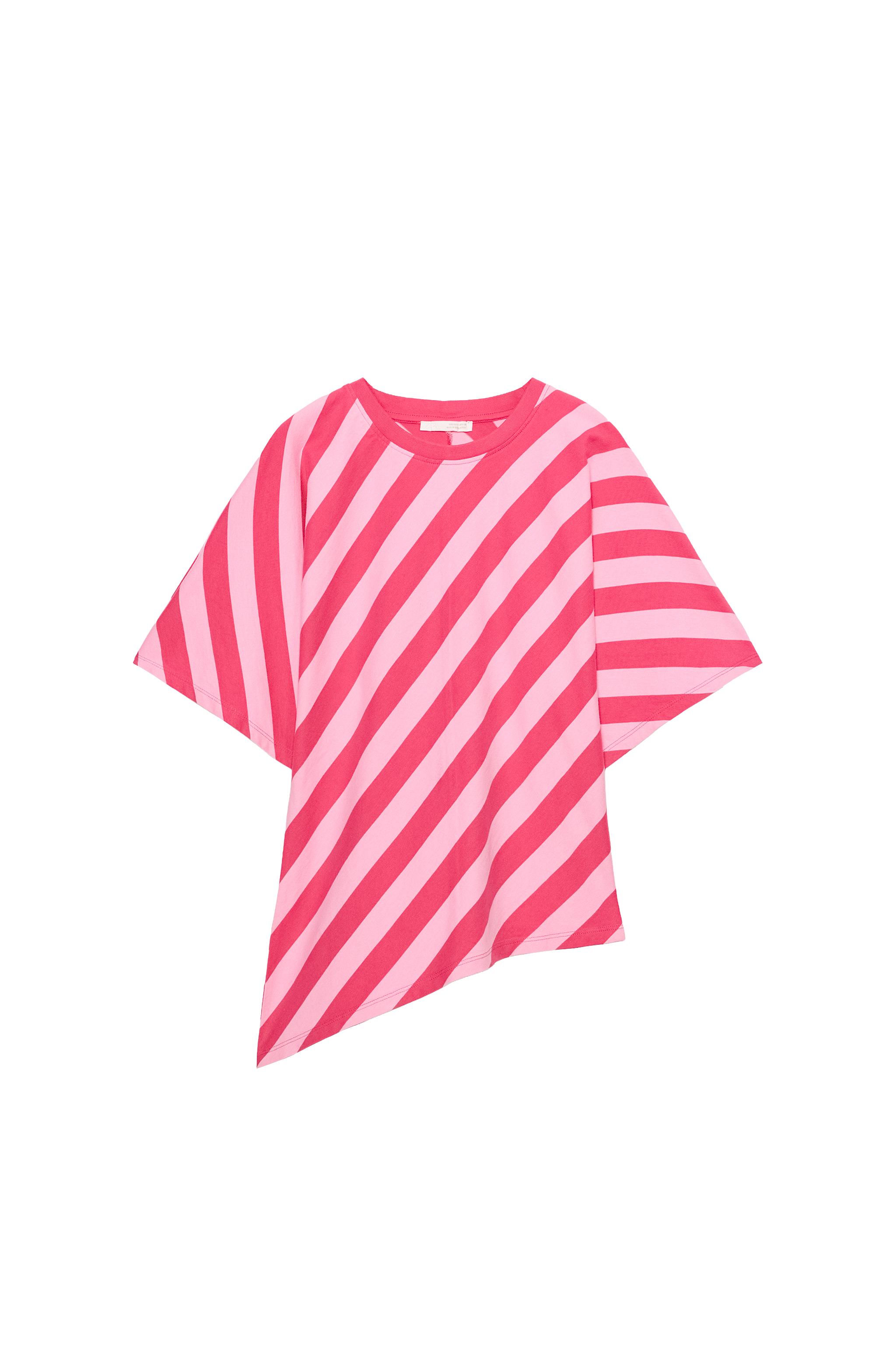 Bu çizgili top, temiz ve sade bir estetikle dikkat çeken bir parçadır. Asimetrik kenar detayı, basit görünümlü olmasına rağmen göze çarpan bir dengede. Uzun govdeli tipler için idealdir çünkü vücut hatlarını dengeler ve daha uzun bir görünüm sunar. Yaz mevsiminde günlük kullanıma uygun, hem evde hem de sokakta rahatça giyilebilir. Beyaz tisortle ve yüksek bel jeans ile kombinleme, casual bir gündüz tarzı oluşturur. Aynı zamanda açık omuzlu bluzla veya kısa kollu bir ceketle de streetwear tarzında bir görünüm elde edilebilir. Renkleri hafif pink tonları olduğu için, siyah deri ayakkabı ve beyaz spor ayakkabıyla da iyi uyum sağlar. Giyildiğinde hafifçe sarkması doğal olsa da, katlanmadan asılı tutulması ve iç katman olarak da kullanılması önerilir.