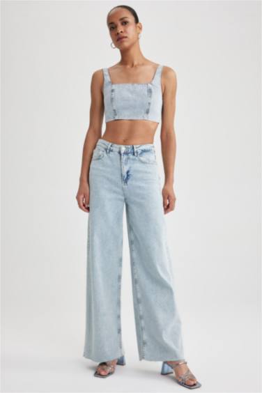 Crop Kare Yaka %100 Pamuk Jean Bluz
