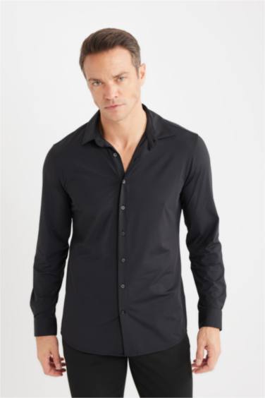 Slim Fit Dar Kesim Polo Yaka Esnek Kumaş Basic Düz Uzun Kollu Siyah Gömlek