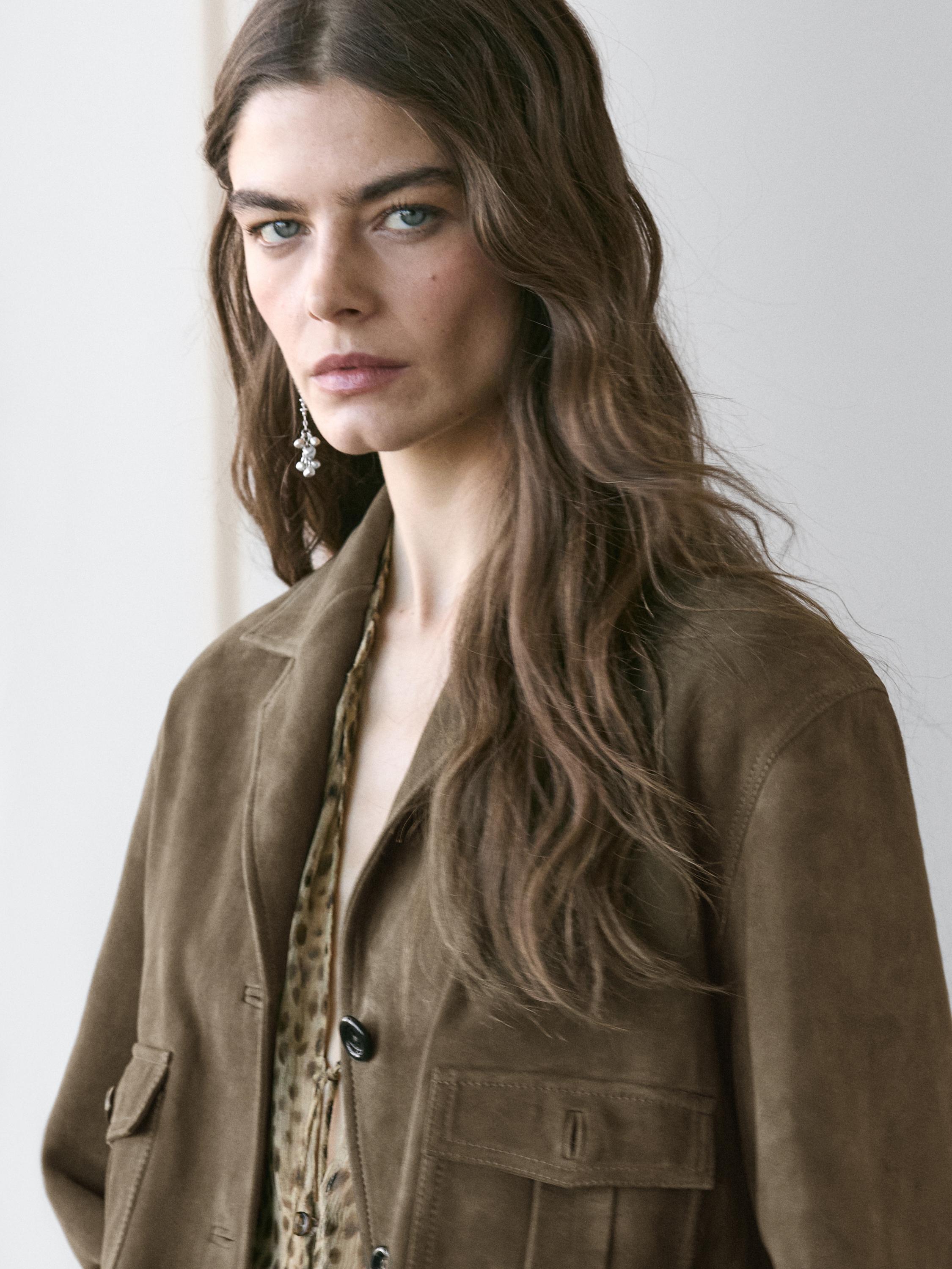 Düşük omuz gömlek, kemerli şalvar, sivri topuklu bot ve uzun trençkot — rahat ama keskin bir şehir tarzı.