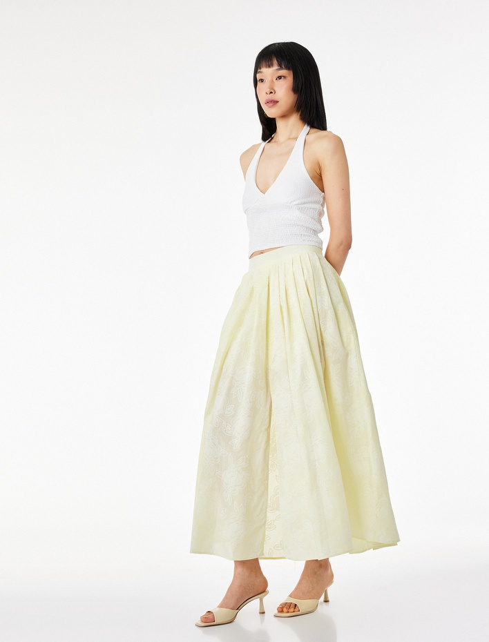Pamuklu Cepli Pileli Floral Dokulu Çan Kesim Midi Kloş Etek
