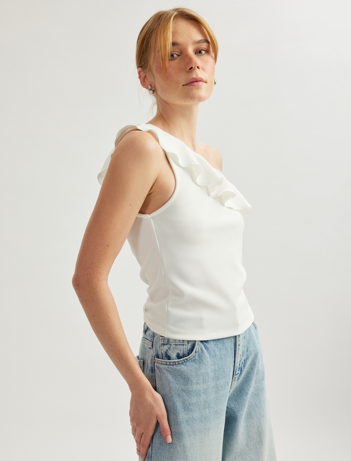 Fırfır Detaylı Kolsuz Tek Omuz Bluz