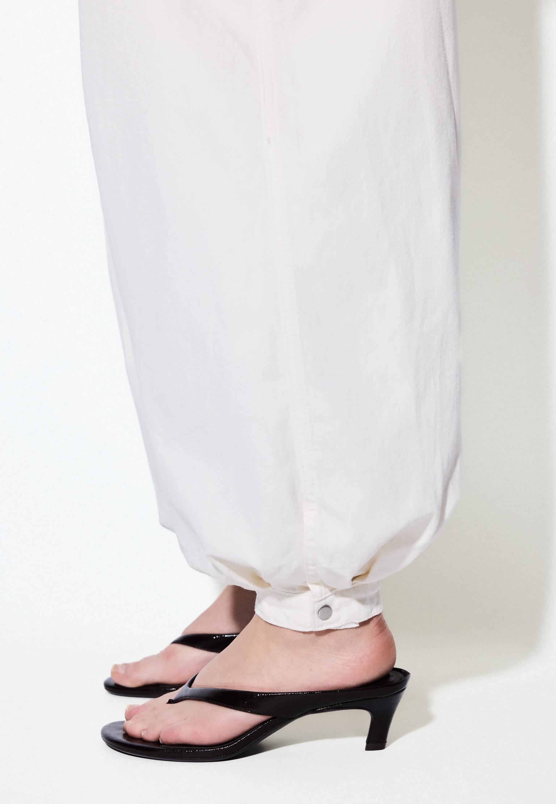 Off-white ve cream renklerindeki bu balon jean, temiz hatlar ve sade detaylarıyla minimalist tarzın en iyi temsilcilerinden biri. Uzun govdeli tipler icin idealdir; dengeli bir boyut verir ve vucudunuzu rahatlatir. Gunesli bir yaz sabahı veya ofis-sonrasi kafe bulusmasinda cok uygun. Beyaz tisortle ve yuksek bel jean ile kombinleme yapabilirsin; bu hem modern hem de hafif bir oyun yaratir. Aynı zamanda koyu mavi bluzla da cok guzel gorunur; klasik ve yorulmaz bir goz aliyor. Siyah deri kemer ve beyaz sneaker ile tamamlayarak daha dinamik bir goz alabilirsin. Kullanim acisindan, katlanmadan asmali ve nemli havada kuru bir yerde saklamali. Icin katman olarak da kullanilabilir, kisa kollu bluzlara altlik olarak ideal.