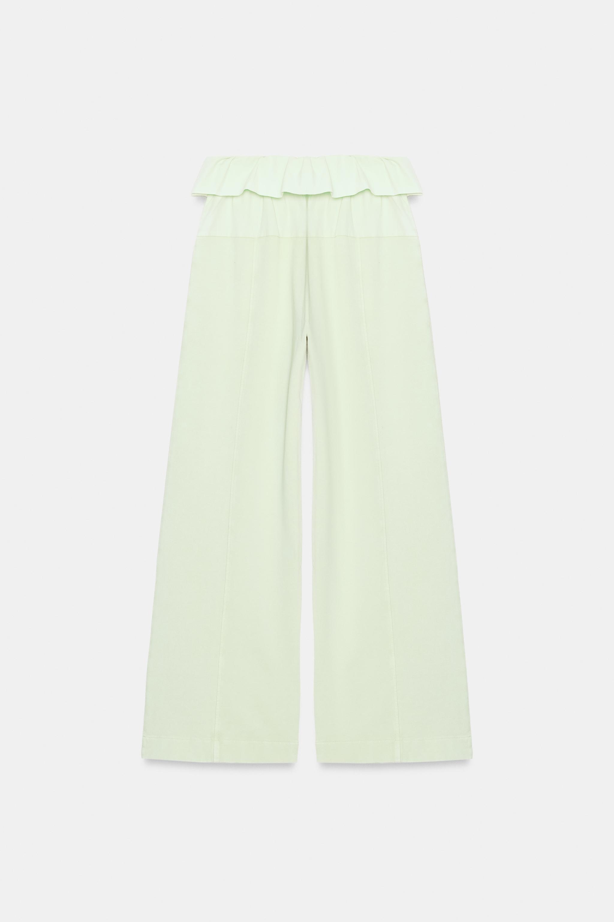 Hafif ve havalı bir dokusuyla bahar ve yaz mevsimlerinde vazgeçilmez bir parca olan poplin beli pantolon, temiz hatları ve notr renkleriyle minimalist tarzın en sadık ally’lerinden biri. Light green ve off-white tonları, hem hafif hem de şık bir dengede. Uzun gövdeli tipler için idealdir çünkü bel kısmı geniş ve koltuk altı hafifçe daralan kesimi, vücut hatlarını doğal bir şekilde vurgular. Günlük kullanıma uygun bu pantolon, beyaz tisörtle ve yüksek bel jeans ile kombinlenebilir; aynı zamanda kısa kollu bir bluzla da çok şık görünür. Sadece siyah deri kemer ve beyaz sneaker ile tamamlayarak rahatça ofis-sonrası bulusmalara da uyan bir görünüm elde edebilirsin. Daha şık bir look istersen, açık gri bir blazer üzerine giyebilirsin. Katlanmadan asmalı, nemli havada kurutmalı ve iç katman olarak da kullanılabilir. Zamanla daha da rahatlayan bir dokusu vardır.