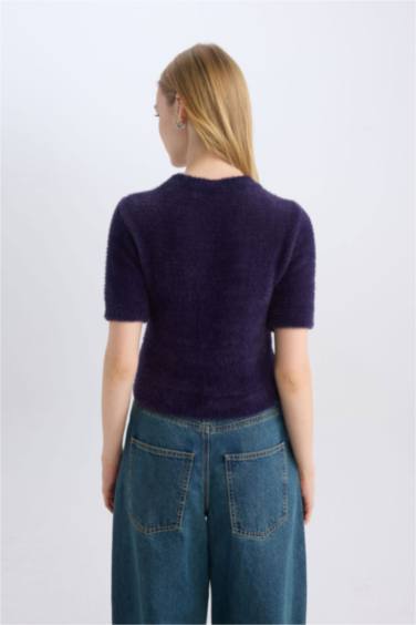 Fitted Bisiklet Yaka Yıldız Baskılı Kısa Kollu Pelüş Triko Kazak