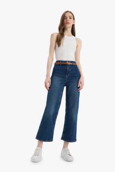 %100 Pamuk Culotte Yüksek Bel Kısa Geniş Paça Kemerli Jean Pantolon