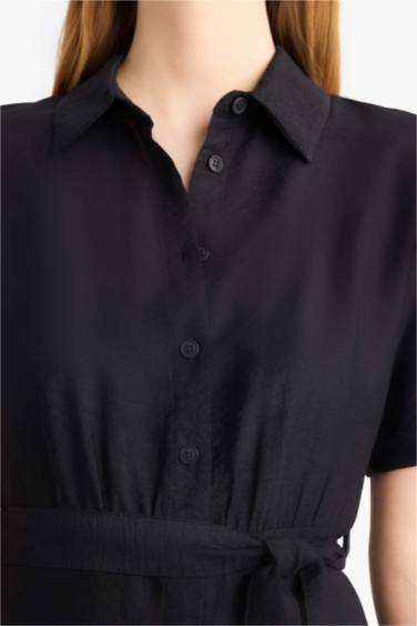 Gömlek Yaka Kuşaklı Kısa Kollu Midi Siyah Yazlık Elbise
