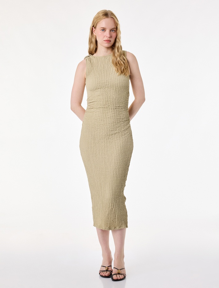 Bürümcük Kumaş Slim Fit Bisiklet Yaka Kolsuz Drapeli Midi Kalem Elbise