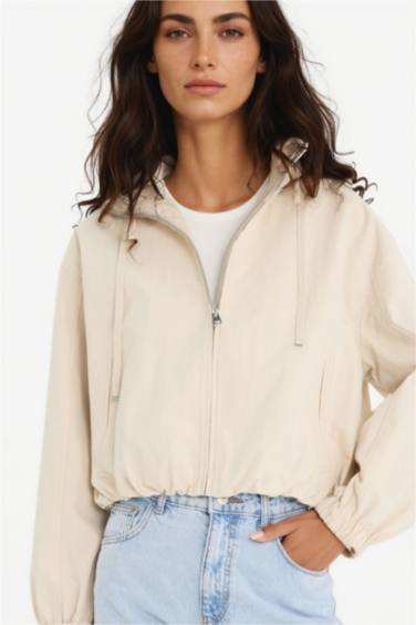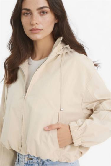 Su Geçirmez Regular Fit Kapüşonlu Fermuarlı Crop Mont
