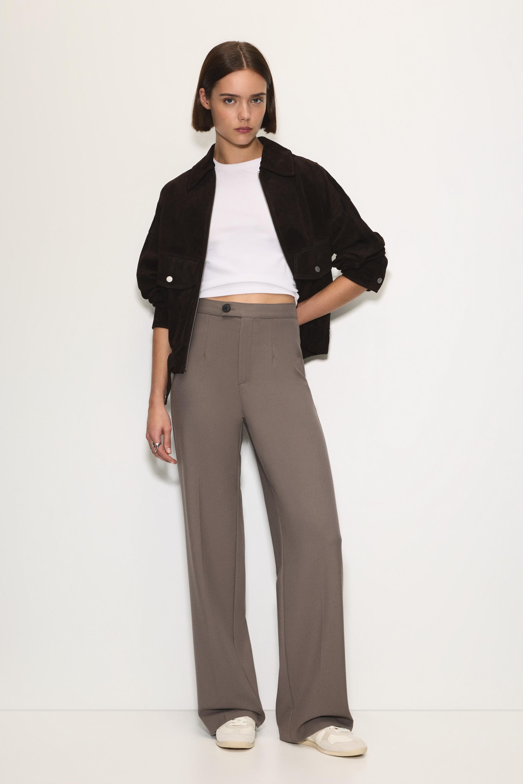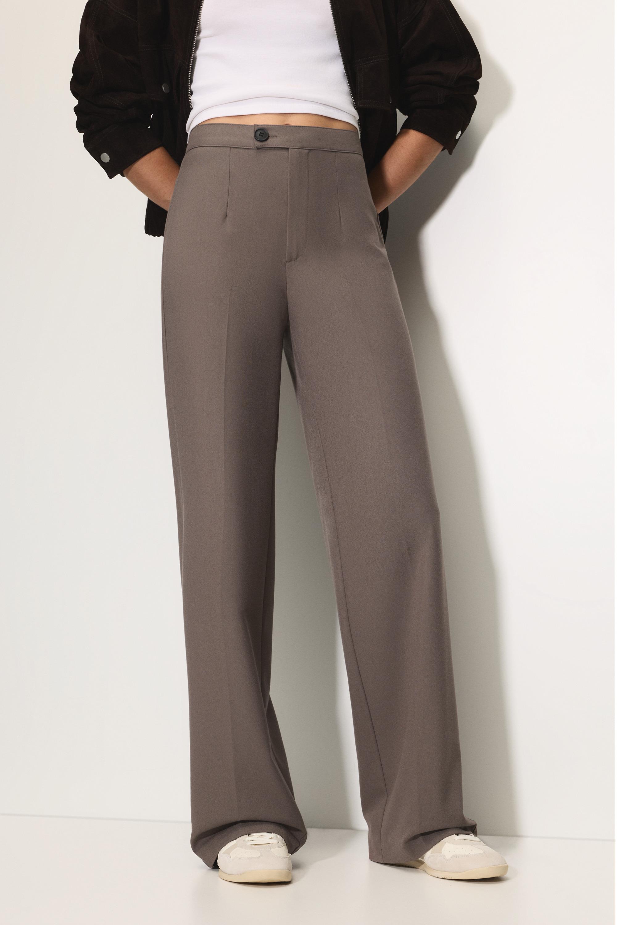 Yüksek bel ve düz kesim klasik pantolon, kapalı ön pilili, kemer köprülü ve düğmeli ve fermuarlı bel detaylı. Cebi yoktur. Pantolonun ağ uzunluğu: 83 cm.