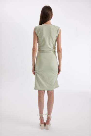 Bodycon Vücuda Oturan Drapeli Krep Kolsuz Mini Abiye Elbise