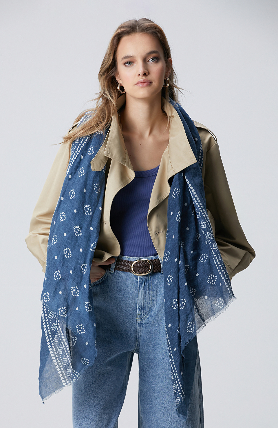 Mavi sal, her zaman gizemli ve hafif bir serinlik hissi katan bir aksesuar. Uzun govdeli tipler icin idealdir; omuzlara hafif bir dalgalandirma yaparak dengeli bir gozukme saglar. Gunesli bir yaz sabahinda ya da sonbahar aksam yuruyuslerinde cok guzel gorunur. Beyaz tisortle ve yuksek bel jean ile kombinlemede hem pratik hem de modayla uyumlu bir gozukme elde edersin. Ayni zamanda, bol yaka bluz ve koyu renk etekle de cok guzel olur. Renk olarak mavi ve beyaz birbiriyle harmanlanirken, siyah deri kemer ve beyaz sneaker ile tamamlayabilirsin. Kullanmadiginda katlanmadan asmali, nemli ortamlardan uzak tutmali. Hem ofis-sonrasi bulusmalarda hem de tatilde rahatca giyilebilir.