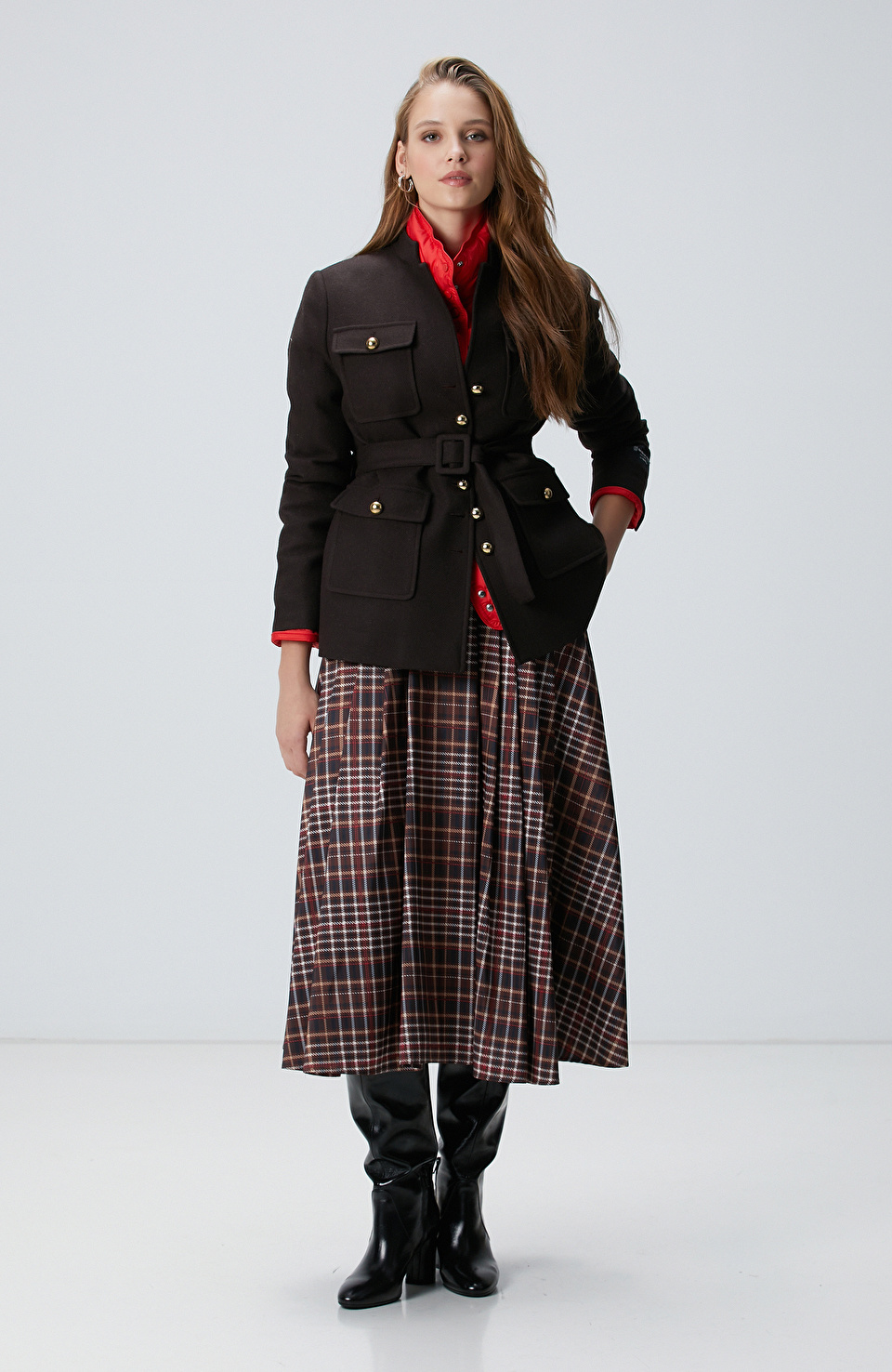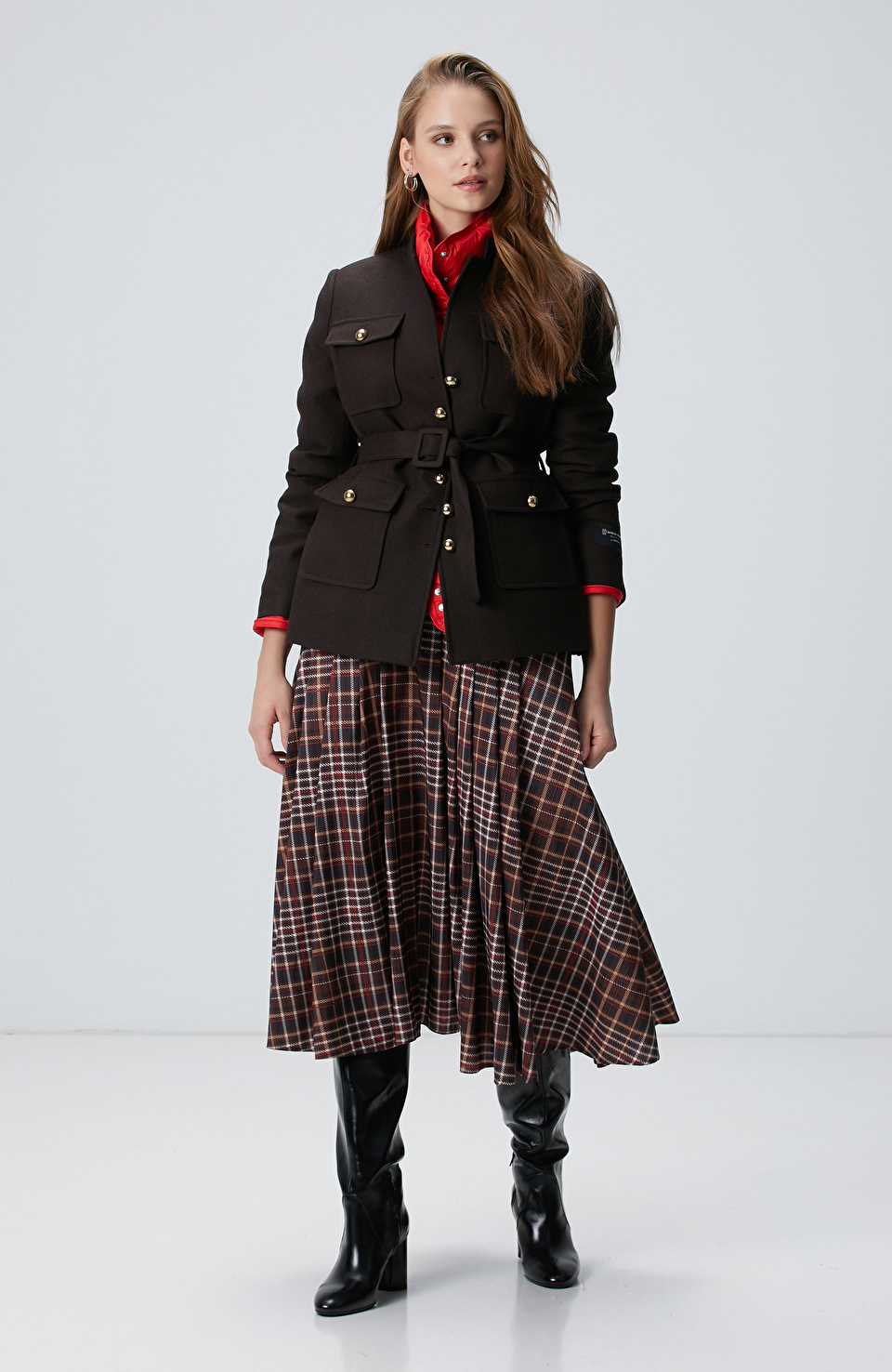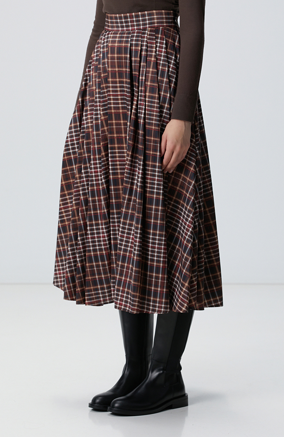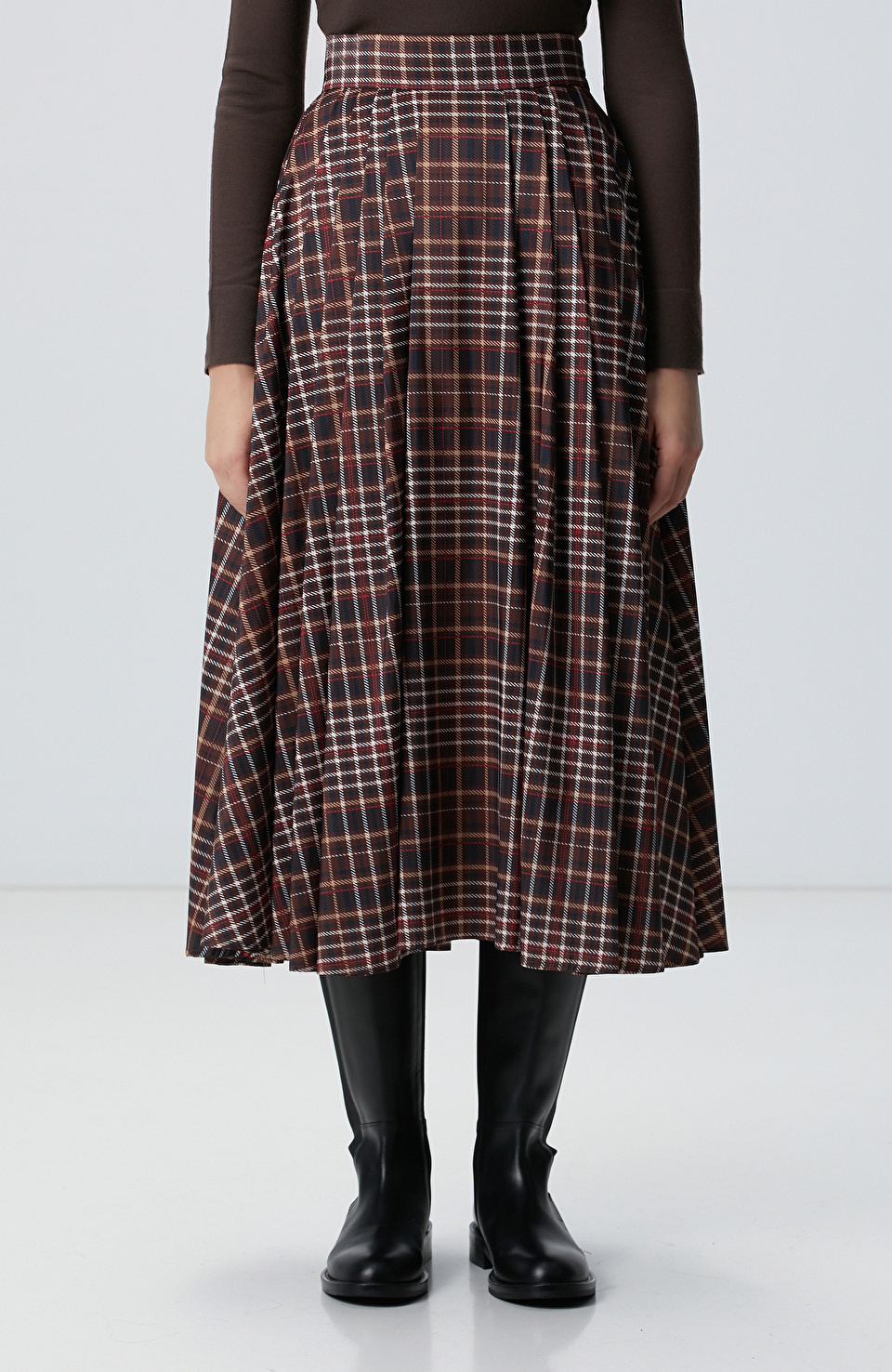 Camel Ekose Desenli Piliseli Midi Tafta Etek