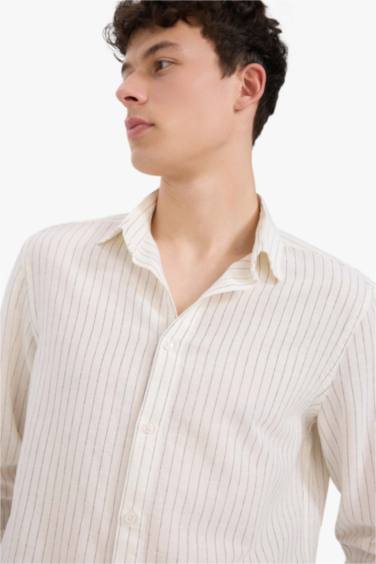 Regular Fit Polo Yaka Çizgili Keten Yazlık Uzun Kollu Gömlek