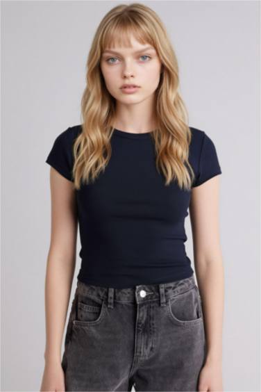 Fıtted Bisiklet Yaka Ribana Kısa Kollu Tişört