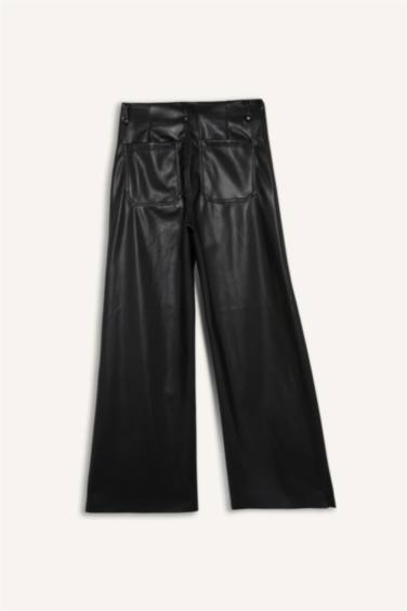 Wıde Leg Fermuarlı Uzun Deri Pantolon