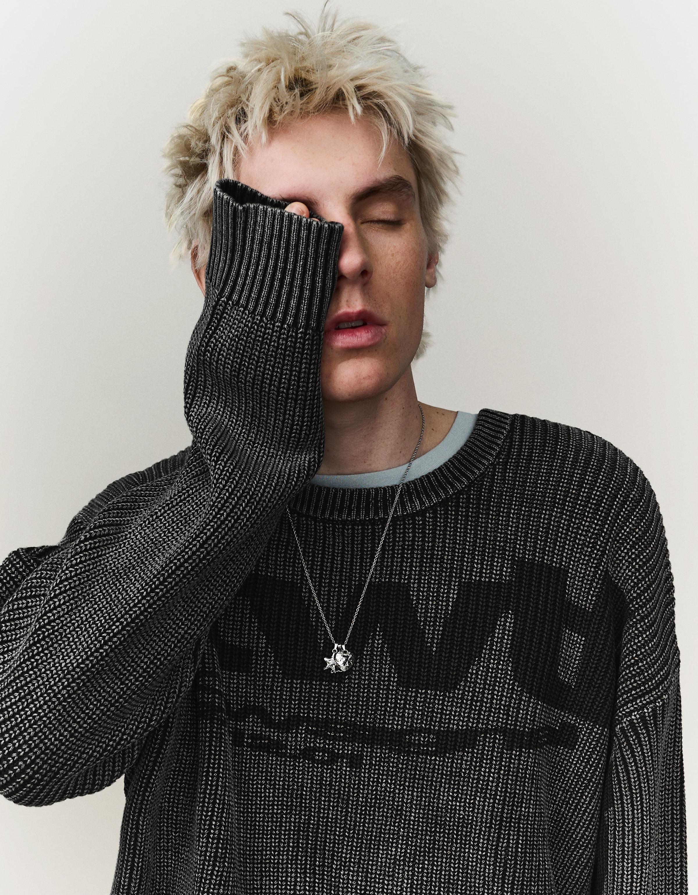 Ajurlu **Ipekyol** triko ile **Stradivarius** siyah geniş paça pantolonun minimalist uyumu — üzerine **Network** süet sneaker tamamlıyor.