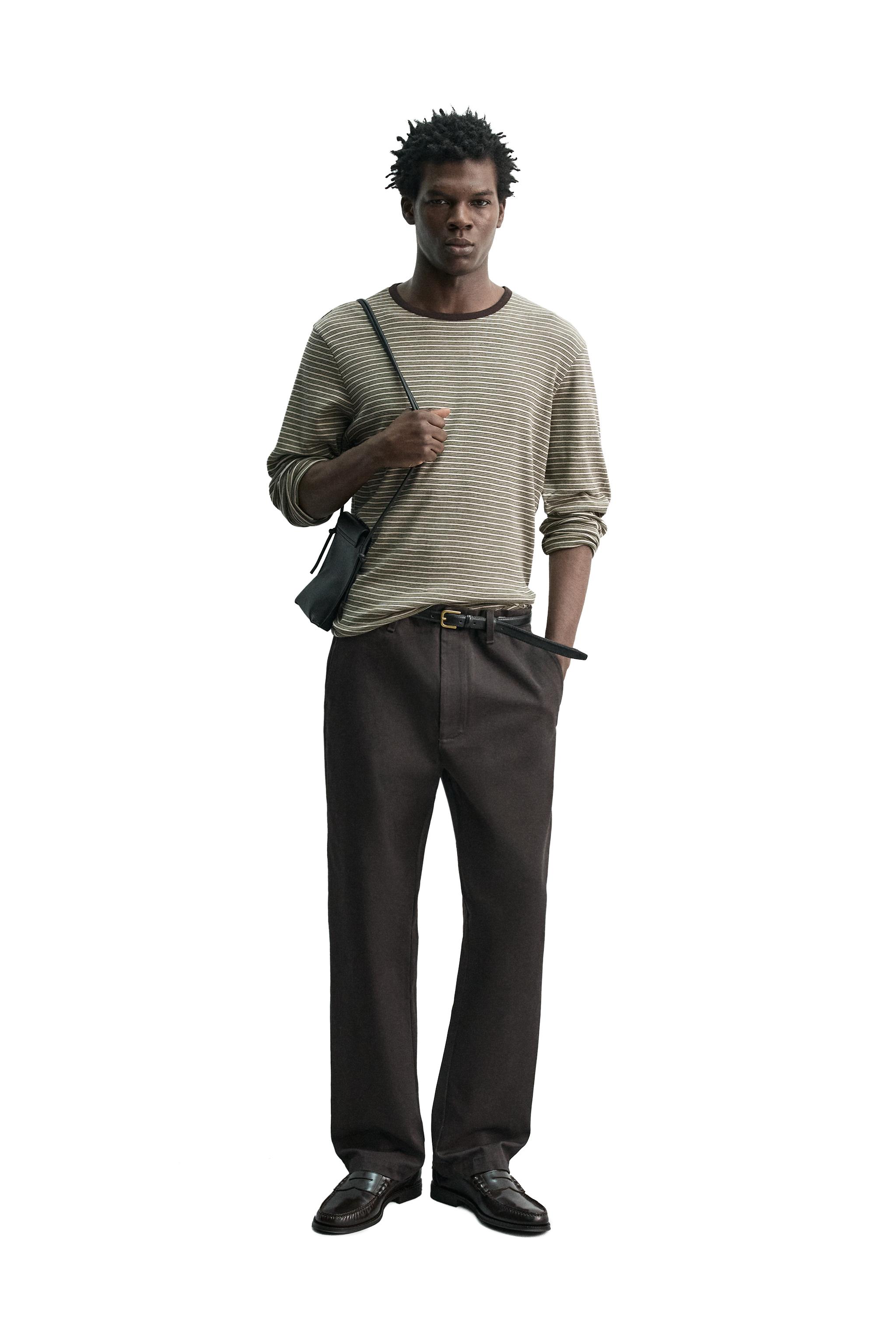 Beige ve kahverengi çizgili bu t-shirt, temiz hatlar ve sade detaylarıyla minimalist tarzın en iyi örneğinden biri. Düzgün bir kalıp ve hafif dokulu kumaşıyla her gün giyilebilecek, ancak aynı zamanda dikkat çeken bir parçaya sahip. Uzun gövdeli tiplere ideal çünkü vücut hatlarını dengelerken rahatlık sağlar. Kısa boylu tipler için ise omuzlara yaslanarak daha dengeli bir görünüm yaratabilirsin. Bahar ve yaz aylarında açık renkli pantolonlarla, sonbaharda ise koyu tonlu elbise veya etekle kombinlenebilir. Beyaz tisörtle ve yüksek bel jeans ile casual bir günlük outfit oluşturabilirsin ya da krem renkli şortla daha dinamik bir hava yakalayabilirsin. Siyah deri kemer ve beyaz sneaker ile tamamlayarak modern bir look elde edebilirsin. Kuru temizlik önerilir; katlanmadan asılı tutulması kumaşın şekli açısından önemlidir. İç katman olarak da kullanılabilir, böylece farklı kombinlerle çok yönlü bir parça olur.