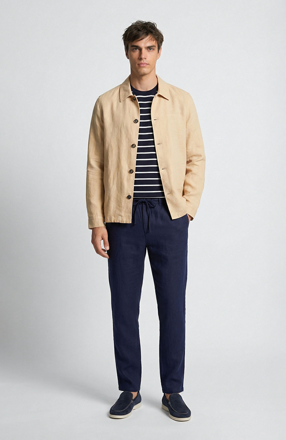 Düşük omuz gömlek, kemerli şalvar, sivri topuklu bot ve uzun trençkot — rahat ama keskin bir şehir tarzı.