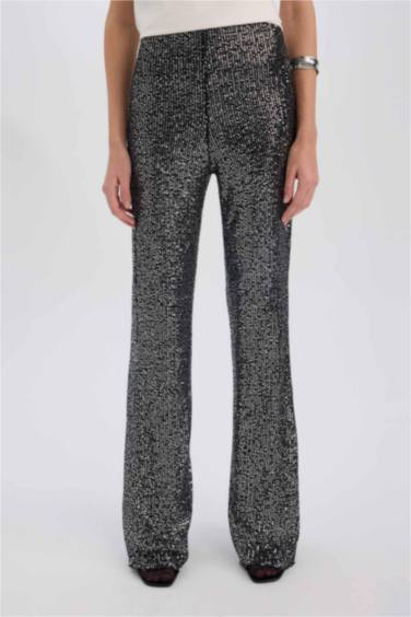 Siyah Şık Payetli Pantolon Flare Fit Yüksek Bel Standart Boy