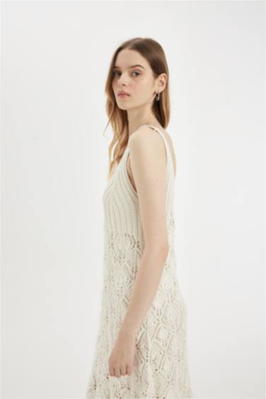 V Yaka Kroşe Beyaz Askılı Midi Triko Elbise