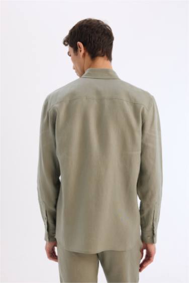 %100 Keten Regular Fit Polo Yaka Yazlık Basic Düz Uzun Kollu Gömlek