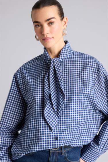 Oversıze Fular Yaka Kareli Poplin Gömlek