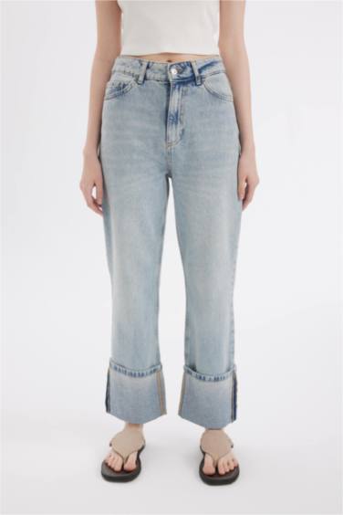 Straight Fit Yüksek Bel Katlamalı Paça Bilek Boy Jean Yıkamalı Pantolon