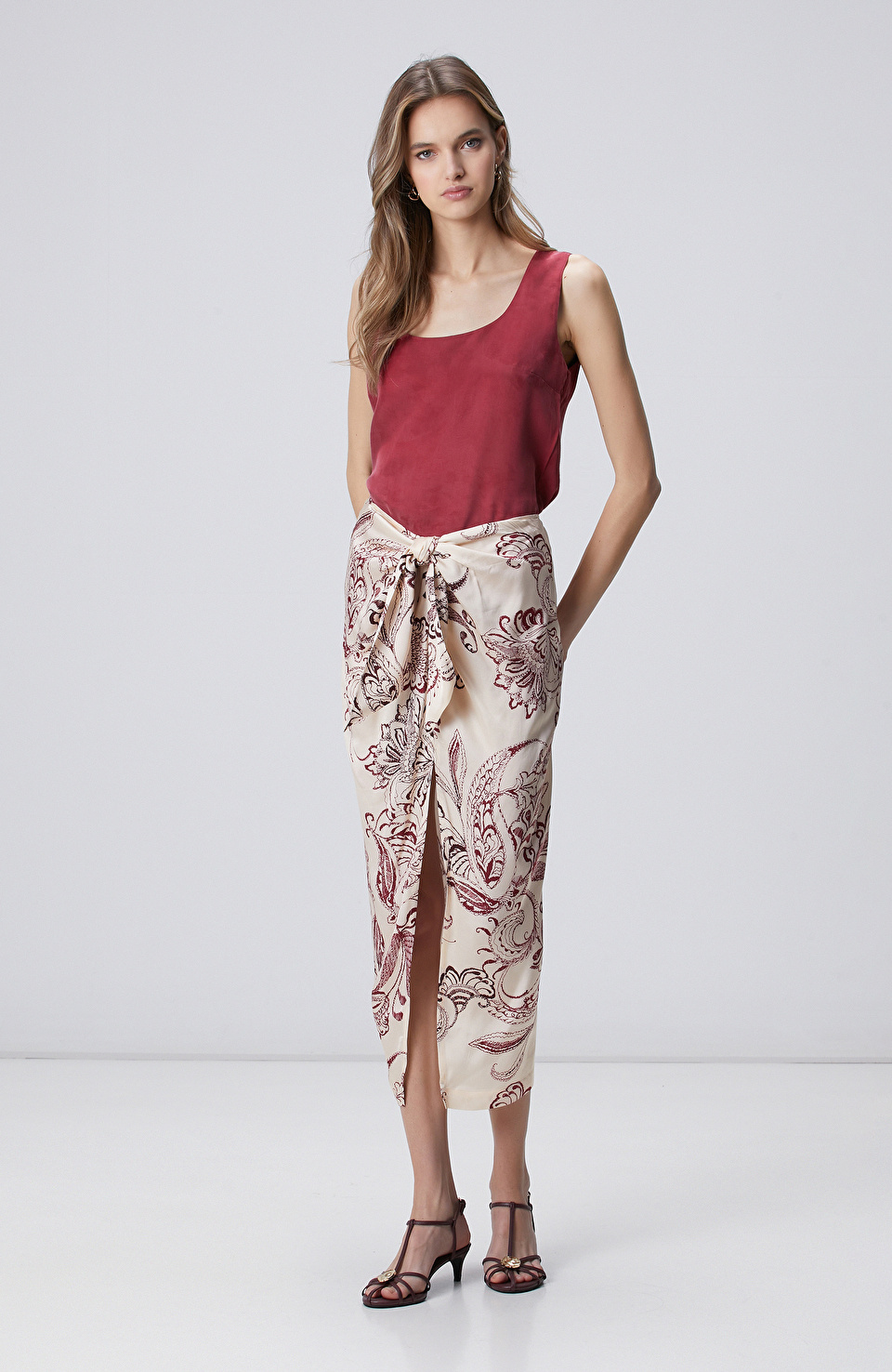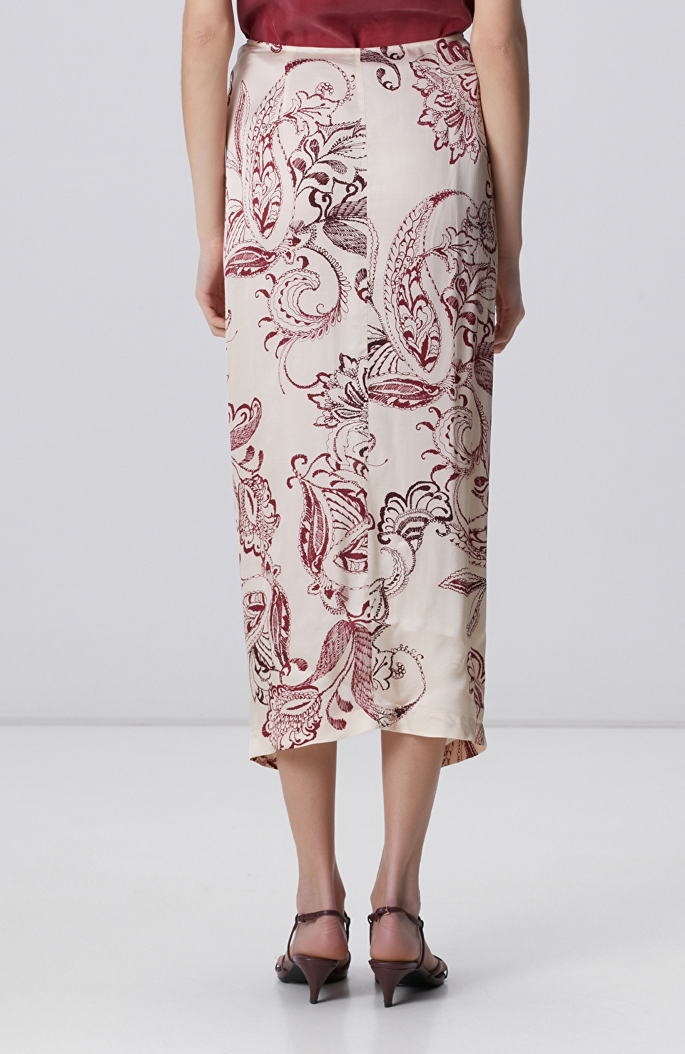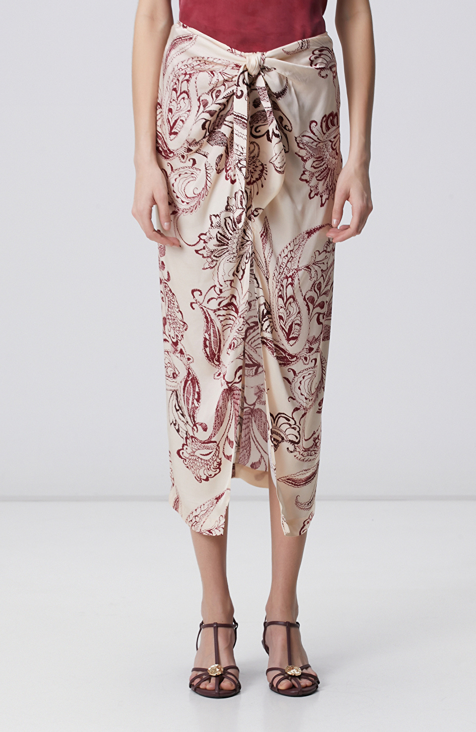 Vişne Şal Desenli Midi Etek