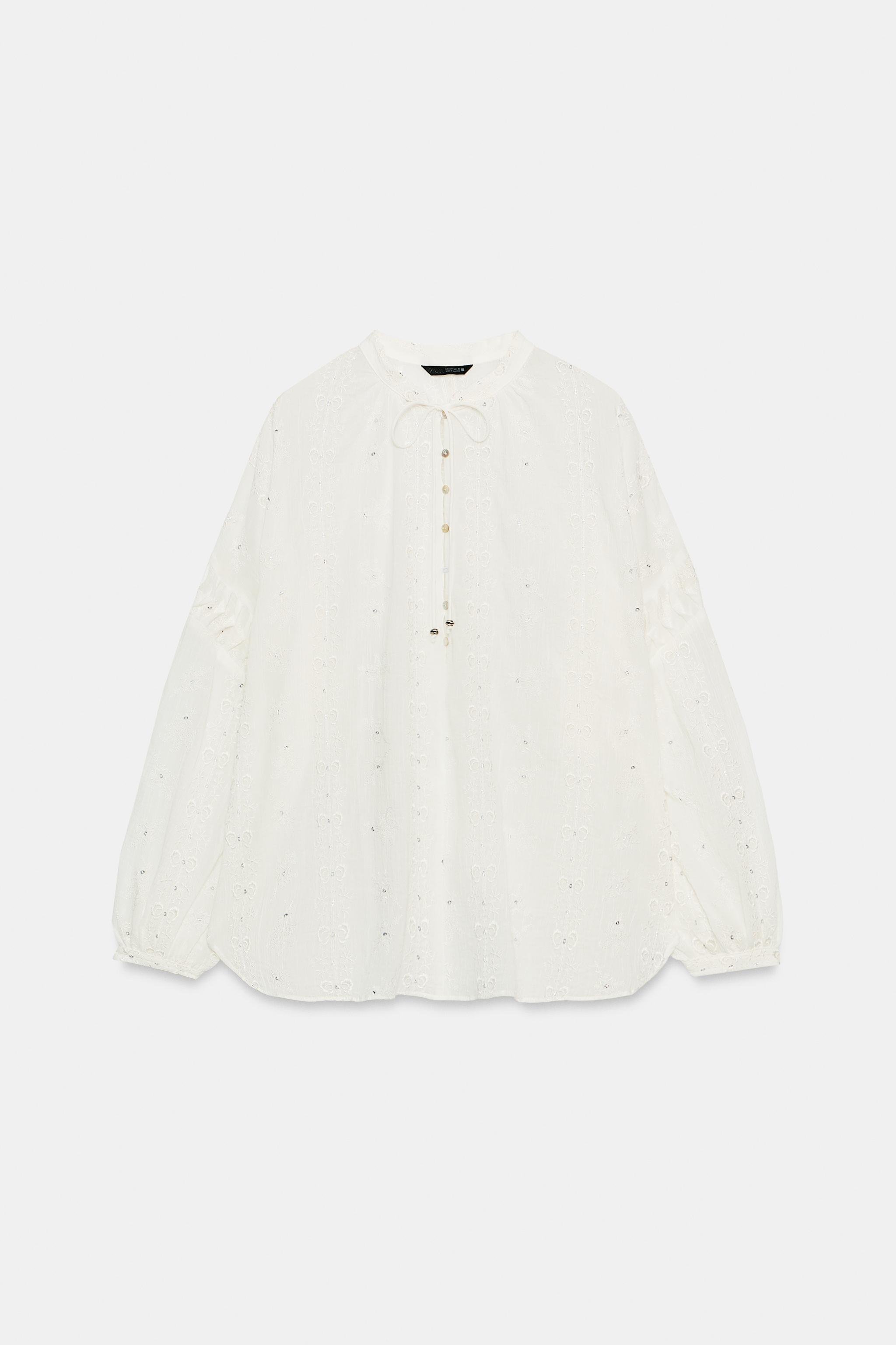 Bu pullu işlemeli bluz, temiz ve dengeli bir estetikle donatılmış, günlük yaşamın her anına uygun bir parca. Uzun govdeli tipler icin idealdir; cok fazla vucudun gozune carpmasini engeller ve hafif bir kemerle de daha dengeli bir gorsel yaratilabilir. Yaz mevsiminde ofis-sonrasi bulusmalarda veya sakin bir park yuruyusunda giyilebilir. Beyaz tisortle ve yuksek bel jean ile kombinleme, rahat ama etkili bir gorsel sunar. Aynı zamanda koyu renk bir pantolonla da klasik bir goz yaratiyor. Off-white ve cream renkleriyle cok ozel bir rengi yok, bu nedenle bol miktarda karmasik olmayan parcalarla kolayca uyum saglanabilir. Aksesuar olarak siyah deri kemer ve beyaz sneaker ile tamamlayabilirsin. Kullanim esnasinda asma seklinde tutmak, katlanmadan kurutmak, dokunuşunu korumak icin onemlidir. Ic katman olarak da kullanilabilir, bu sayede hem zahmetsiz hem de modaya uygun bir guzellige kavusabilirsin.