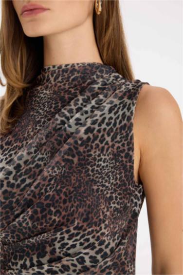 Bodycon Vücuda Oturan Bisiklet Yaka Leopar Desenli Tül Kolsuz Maxi Elbise