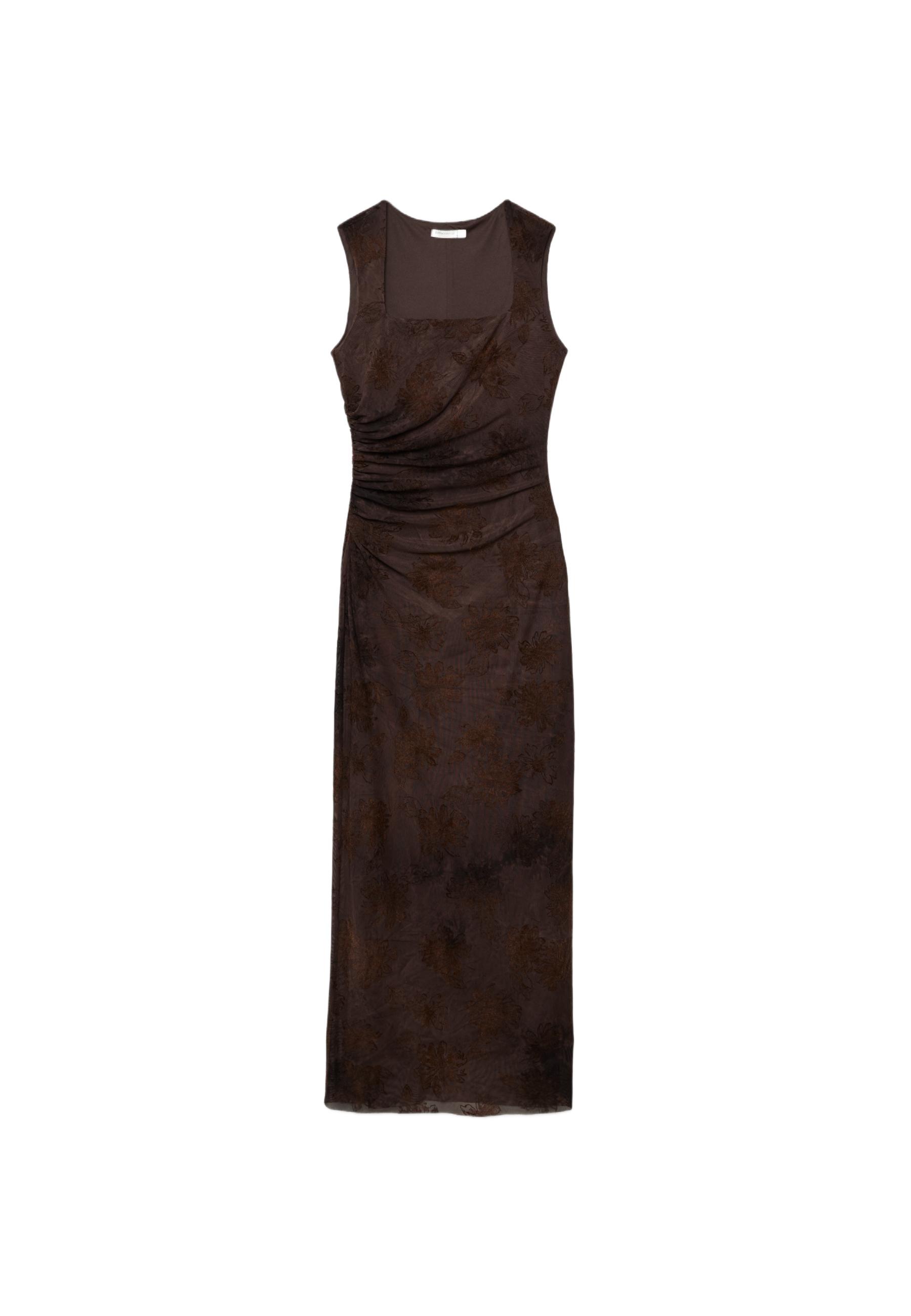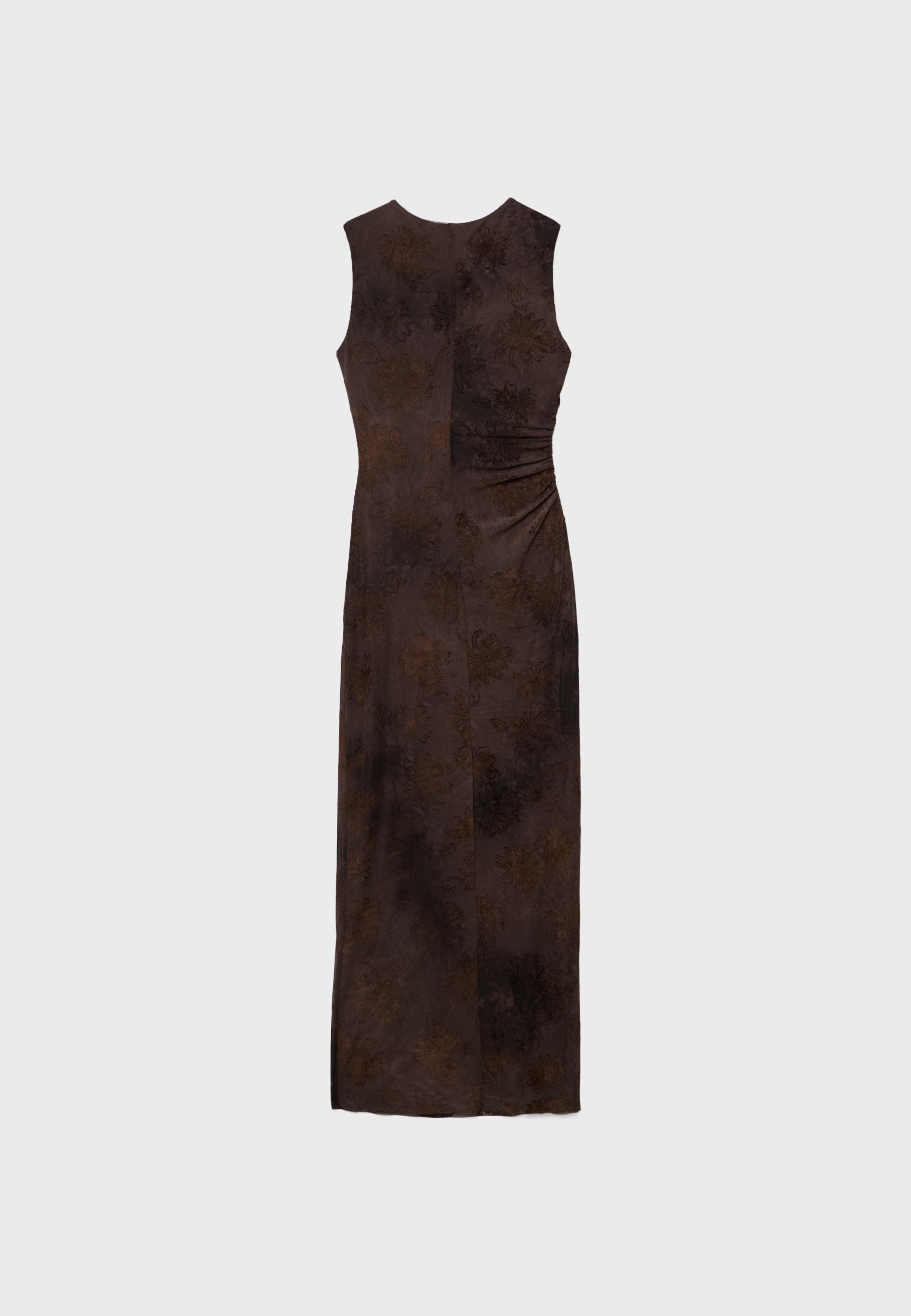Desenli tül kumaştan üretilmiş midi elbise. Kare yaka ve kolsuz. Yanlarda büzgü kumaş detaylı. Ton sür ton iç astarlı.